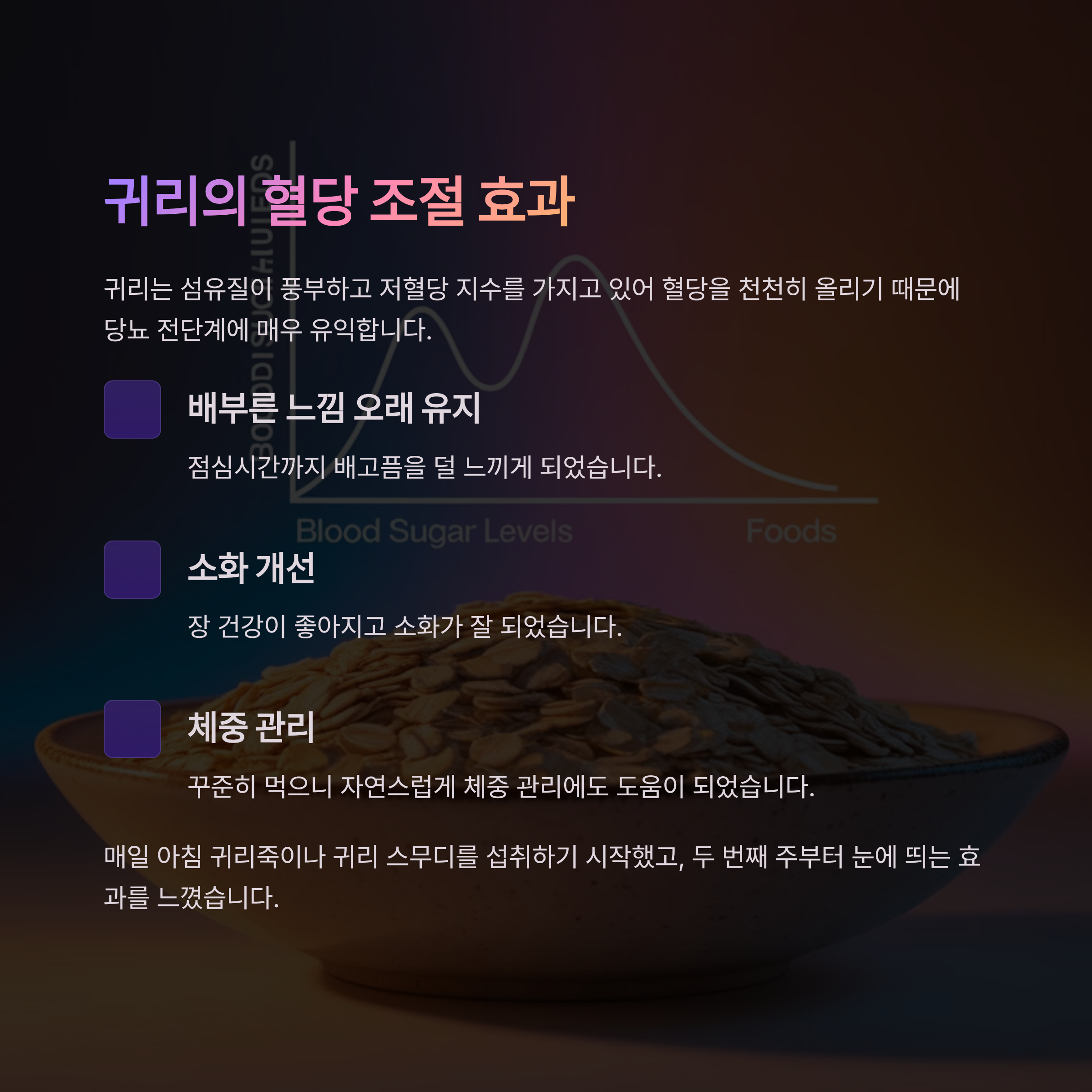 저는 귀리를 한 달간 매일 아침에 섭취했어요. 첫 주에는 큰 변화가 없었지만, 두 번째 주부터 눈에 띄는 효과를 느낄 수 있었어요. 특히 식사 후 혈당을 체크했을 때, 귀리를 섭취한 날에는 혈당 상승이 덜한 걸 느꼈습니다. 그 후 건강검진에서 혈당 수치가 개선되었고, 당뇨 전단계에서 탈출한 것을 알게 되었습니다.
