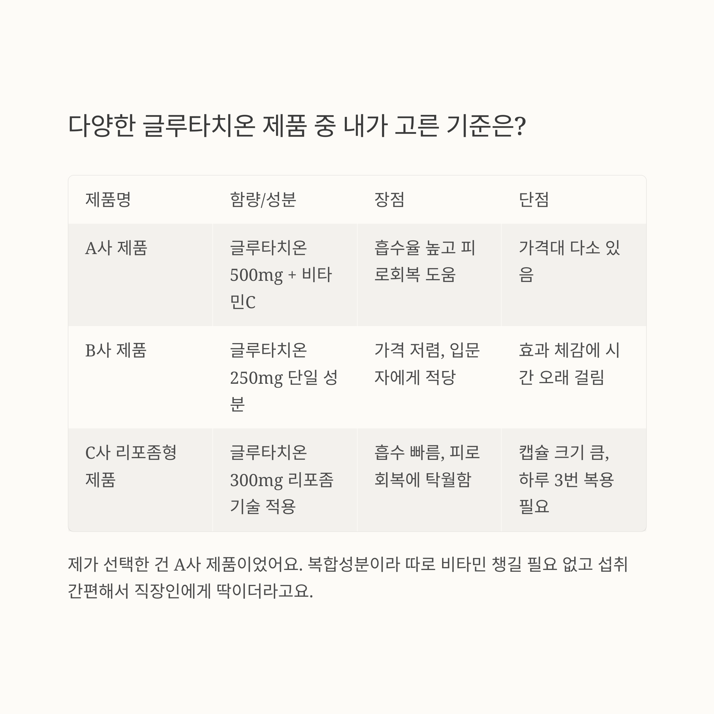 | A사 제품 | 글루타치온 500mg + 비타민C | 흡수율 높고 피로회복 도움 | 가격대 다소 있음 |