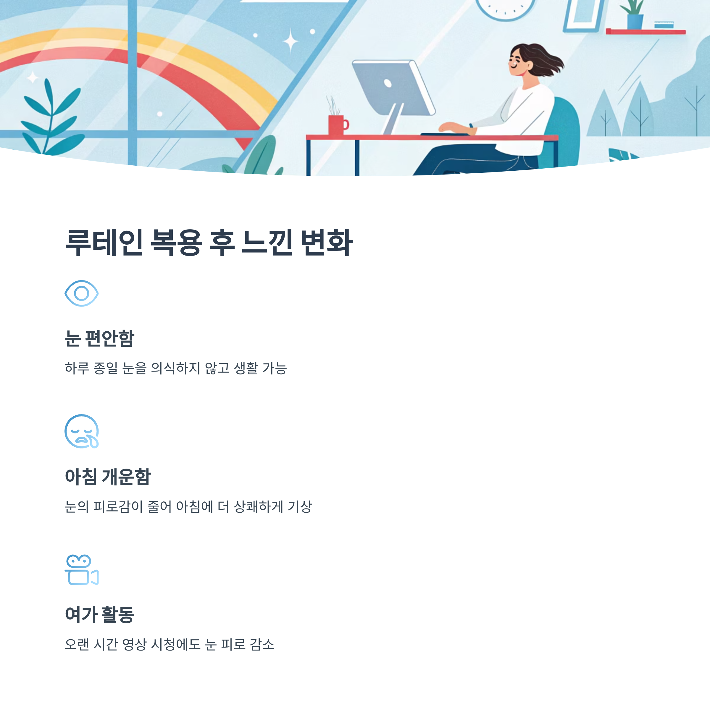 가장 좋았던 건 ‘눈을 의식하지 않고 살 수 있게 된 것’이에요. 예전엔 퇴근하면 꼭 찜질을 해야 했는데, 요즘은 루테인 덕분인지 하루 종일 눈이 편안해요.