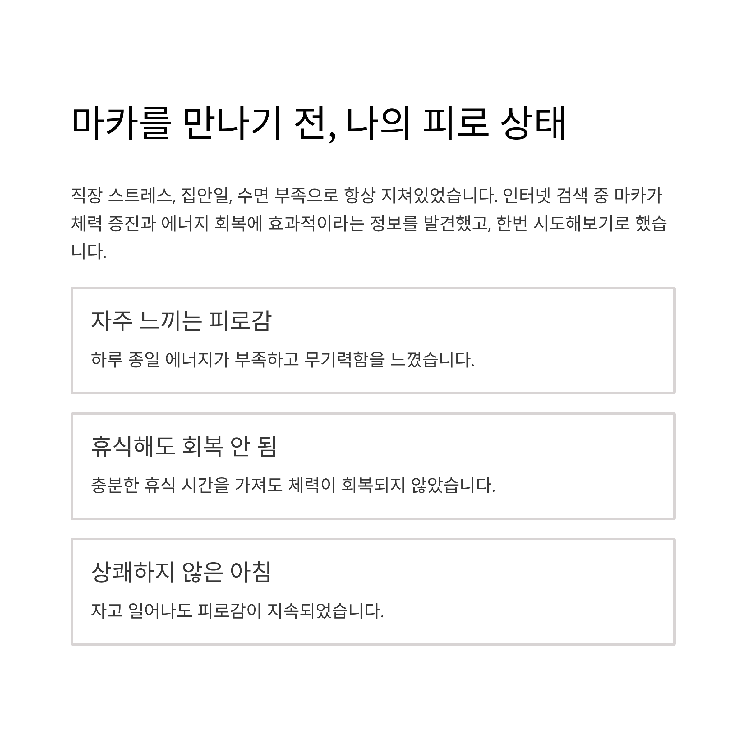 피로감이 덜어졌고, 하루 종일 지치지 않음을 느꼈습니다. 특히 오후 시간이 되면 항상 졸음이 쏟아졌었는데, 그 느낌이 사라졌어요. 그리고 무엇보다 마카 섭취 후 몸이 가벼워지면서, 하루를 더 활기차게 보낼 수 있었습니다.