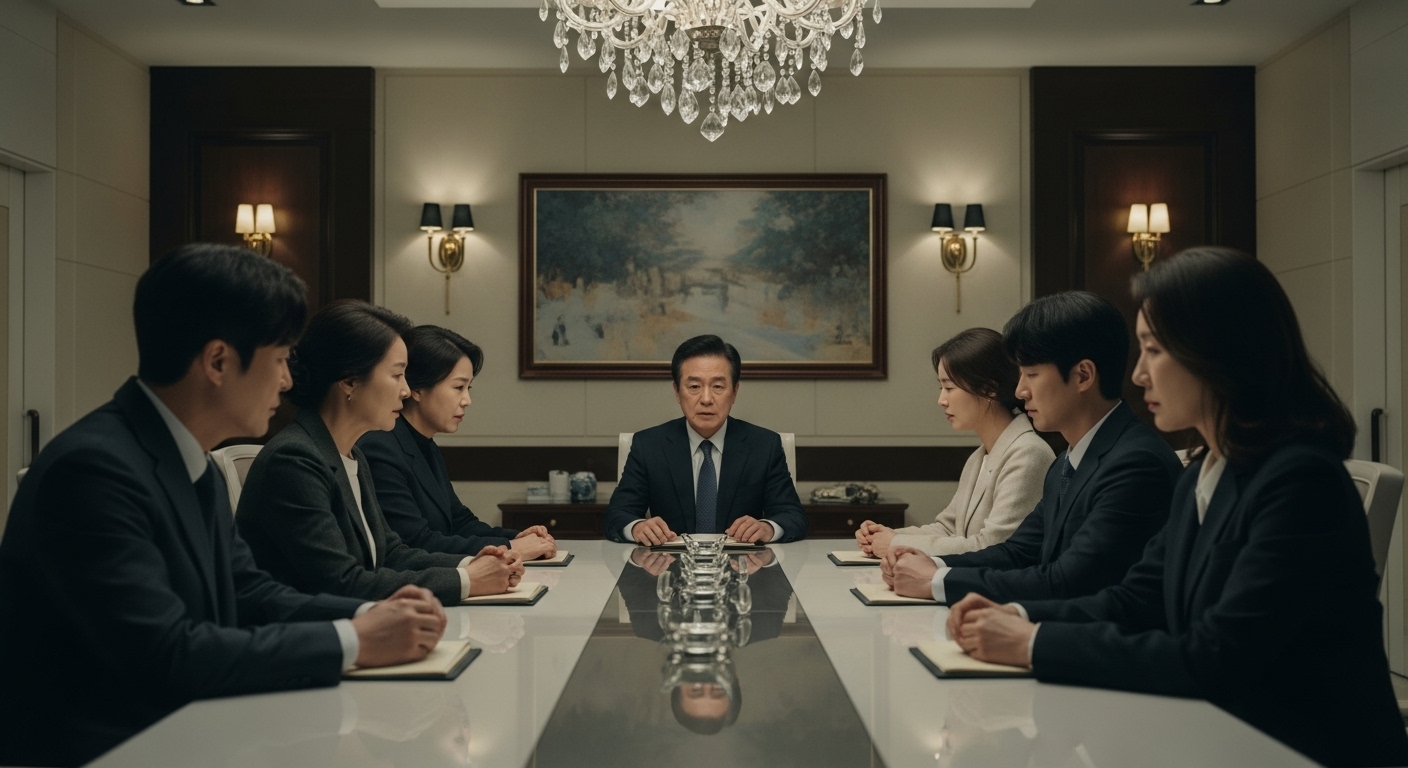 그날 저녁, 성도병원 VIP 라운지에서 긴급 가족회의가 열렸어요. 강철수 회장, 준혁, 수진, 민준, 민재, 그리고 서희까지 모두 모였어요.