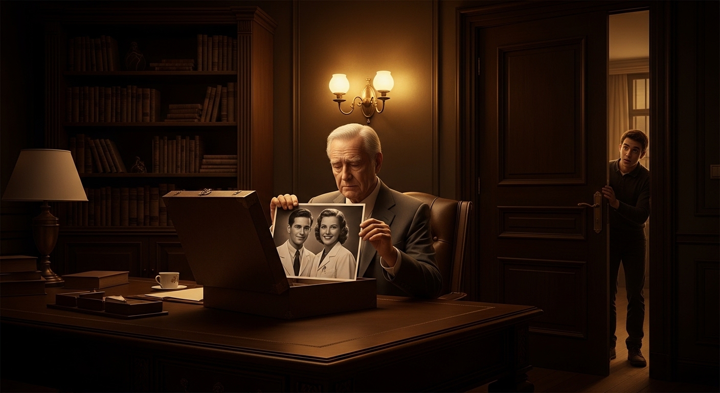 민준이 조심스럽게 다가가 문틈으로 안을 들여다봤어요. 할아버지 강철수 회장이 책상 앞에 앉아 오래된 상자를 열고 있었어요. 회장의 손이 떨리고 있었고, 그의 얼굴에는 깊은 슬픔이 어려 있었어요.