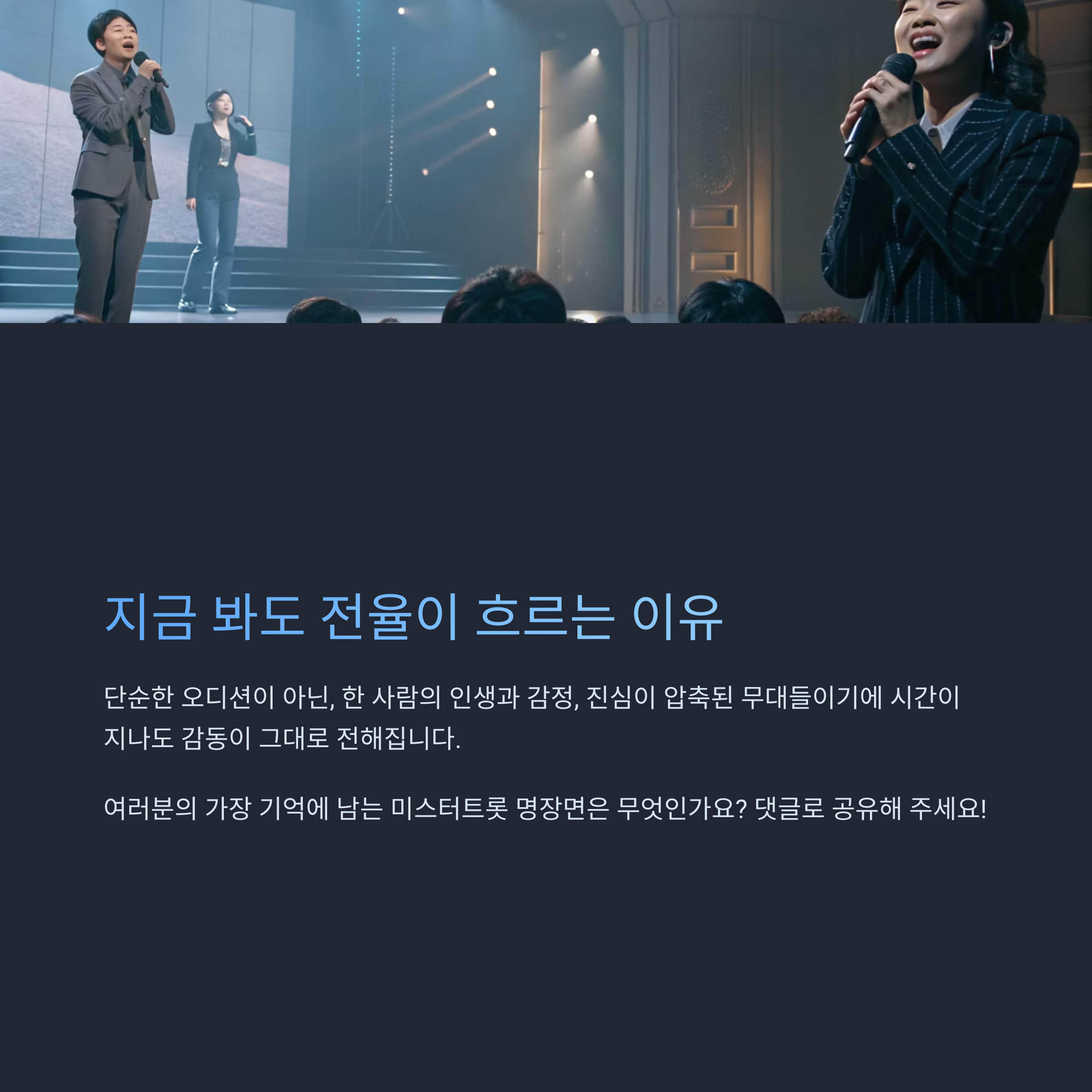 저도 본방 때는 TV 앞에서, 지금은 핸드폰으로 반복 시청하는 입장에서 그 감동이 바래지지 않더라고요. 그게 미스터트롯의 힘이고, 이 프로그램이 오래도록 회자되는 이유입니다.