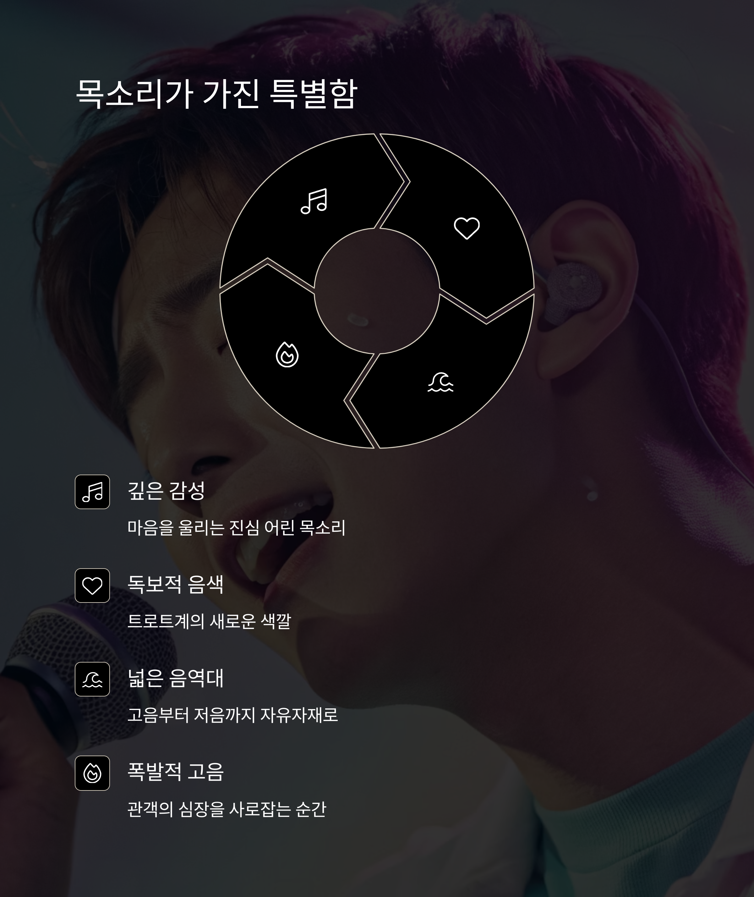 부드럽고 따뜻한 중저음 중심의 창법으로, 편안함과 공감을 자아냅니다.