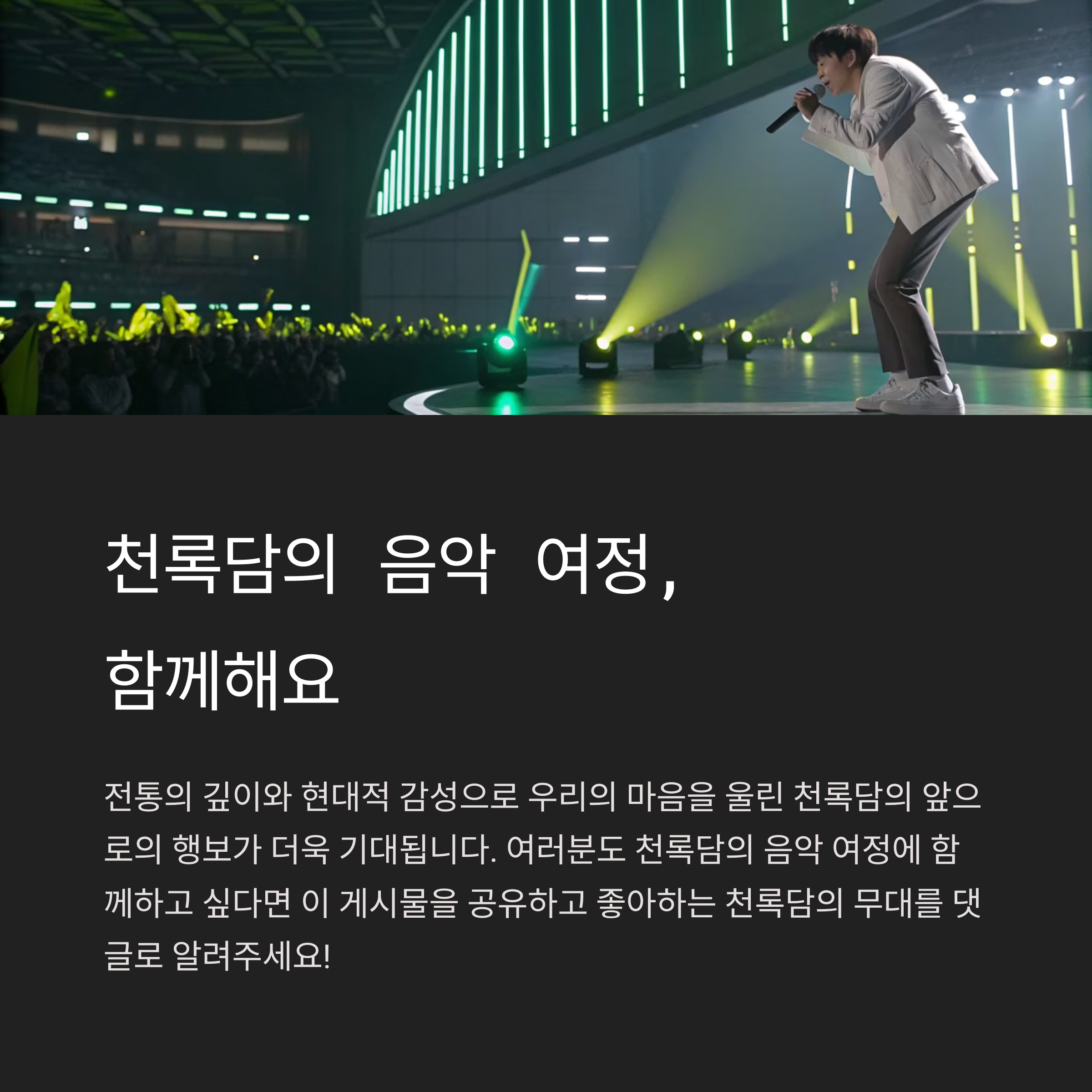 천록담 님의 무대를 보며 문득 이런 생각이 들었어요. 화려하지 않아도 깊이 있고, 자극적이지 않아도 오래 남는 무대가 있다는 것. 어쩌면 우리 인생도 그렇잖아요. 조용히 자신의 길을 걸어가지만, 누군가의 기억에 오래 남는 사람. 천록담 님이 바로 그런 존재인 것 같아요. 앞으로도 그의 음악이 우리 마음속 깊은 곳을 두드리길 기대하며, 여러분과 함께 그의 다음 무대를 기다려봅니다.