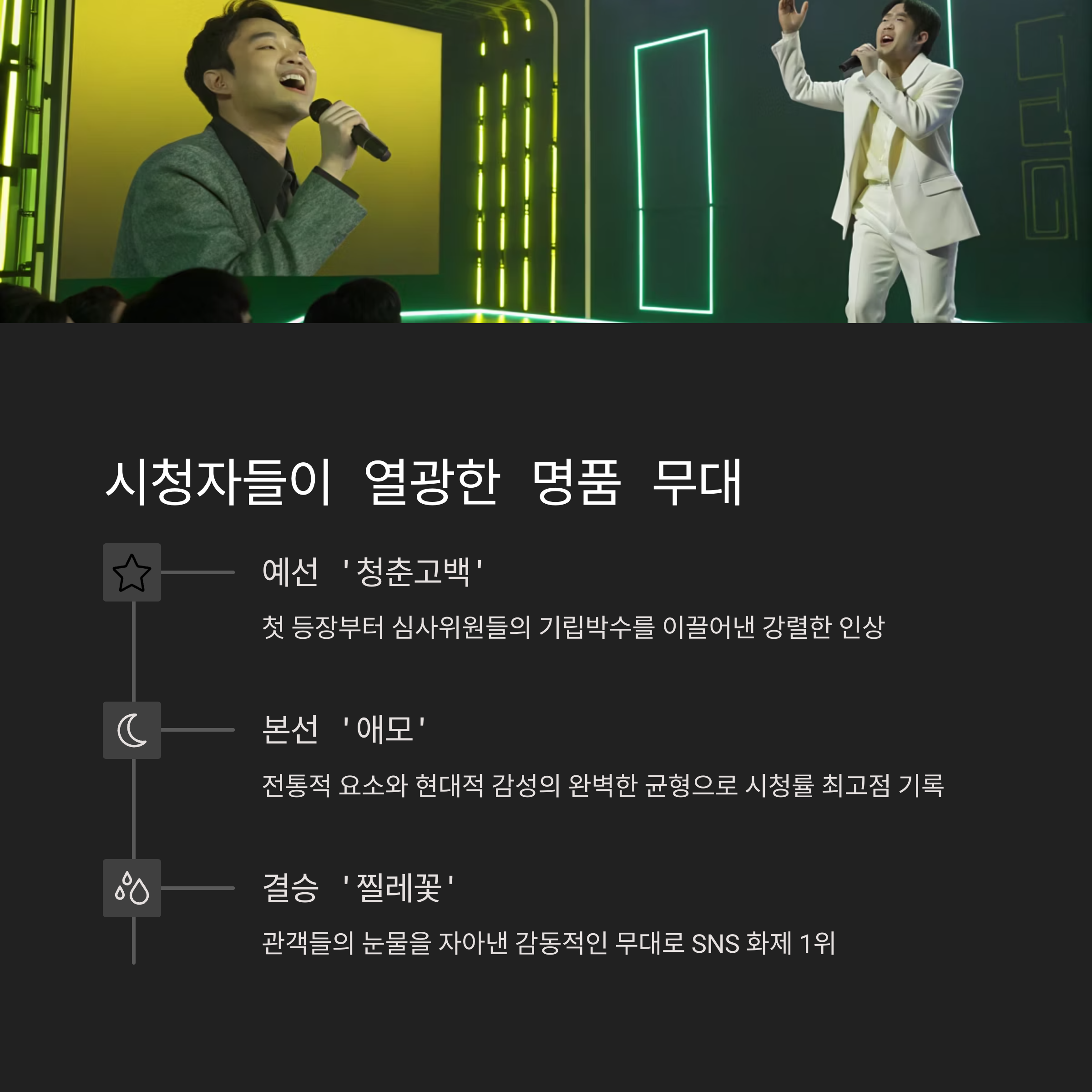 천록담의 무대는 화려하진 않지만, 단단했습니다. 고음에서 흔들림 없는 발성과, 절제된 감정 표현이 특히 인상 깊었는데요. 무엇보다도 마이크를 잡는 순간 시선을 사로잡는 집중력이 남달랐습니다.