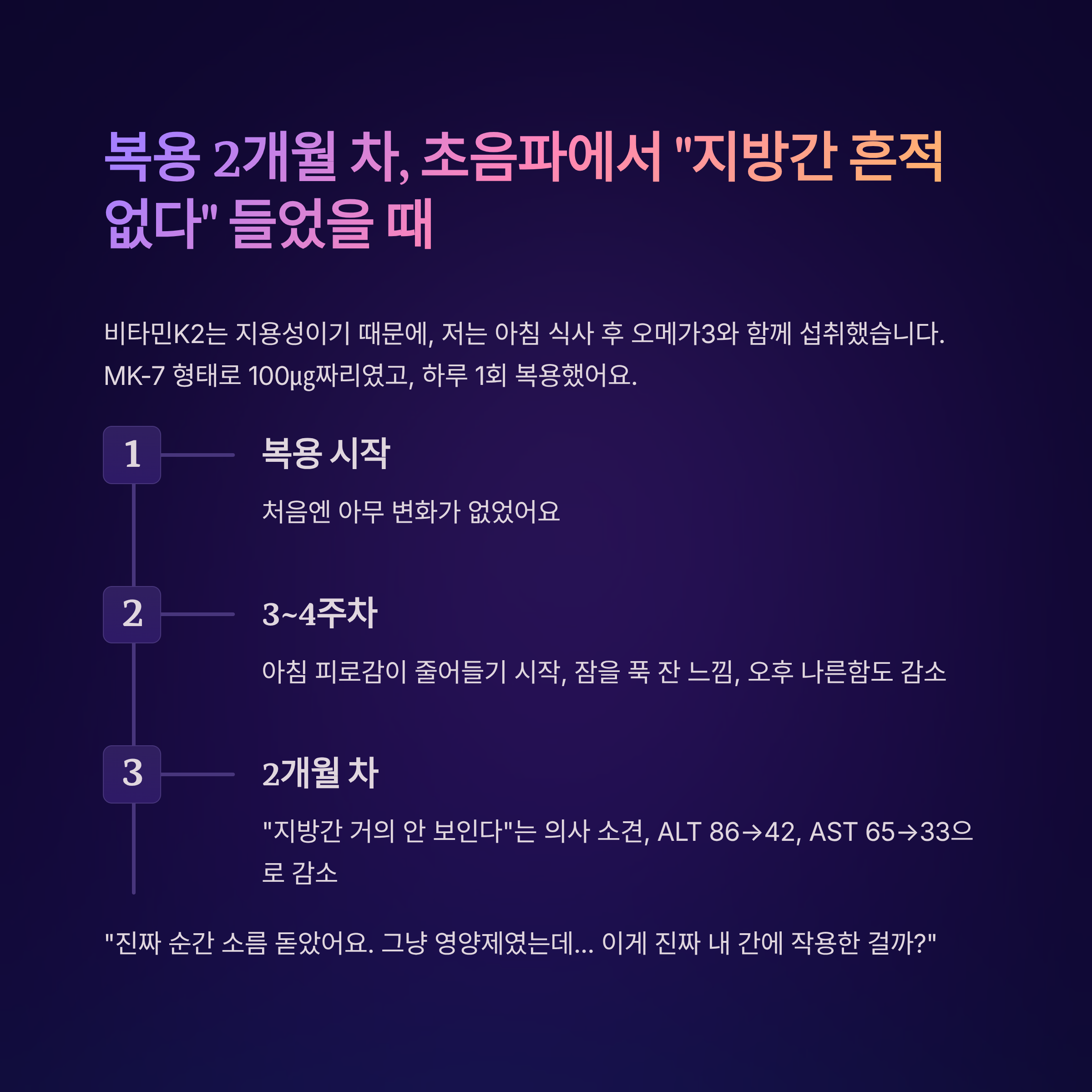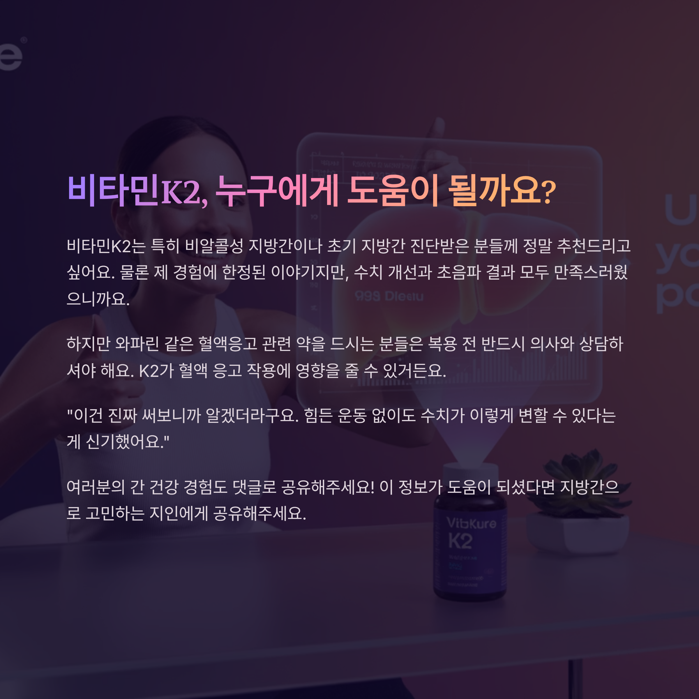 비타민K2는 특히 비알콜성 지방간이나 초기 지방간 진단받은 분들께 정말 추천드리고 싶어요. 물론 제 경험에 한정된 이야기지만, 수치 개선과 초음파 결과 모두 만족스러웠으니까요.