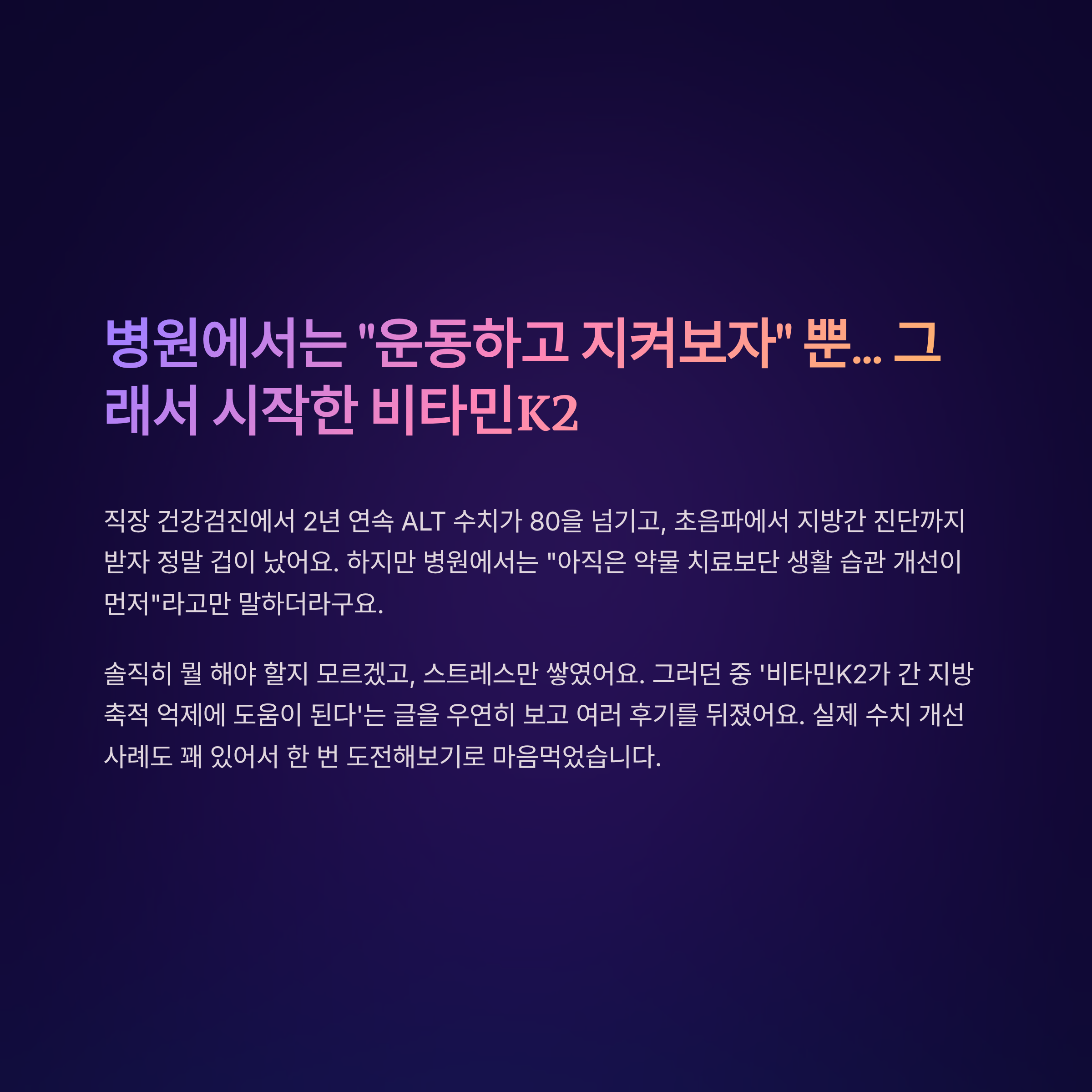 하지만 병원에서는 “아직은 약물 치료보단 생활 습관 개선이 먼저”라고만 말하더라구요. 솔직히 말해 뭘 해야 할지 모르겠고, 스트레스만 쌓였어요. 그러던 중 ‘비타민K2가 간 지방 축적 억제에 도움이 된다’는 글을 우연히 보고 여러 후기를 뒤졌어요.