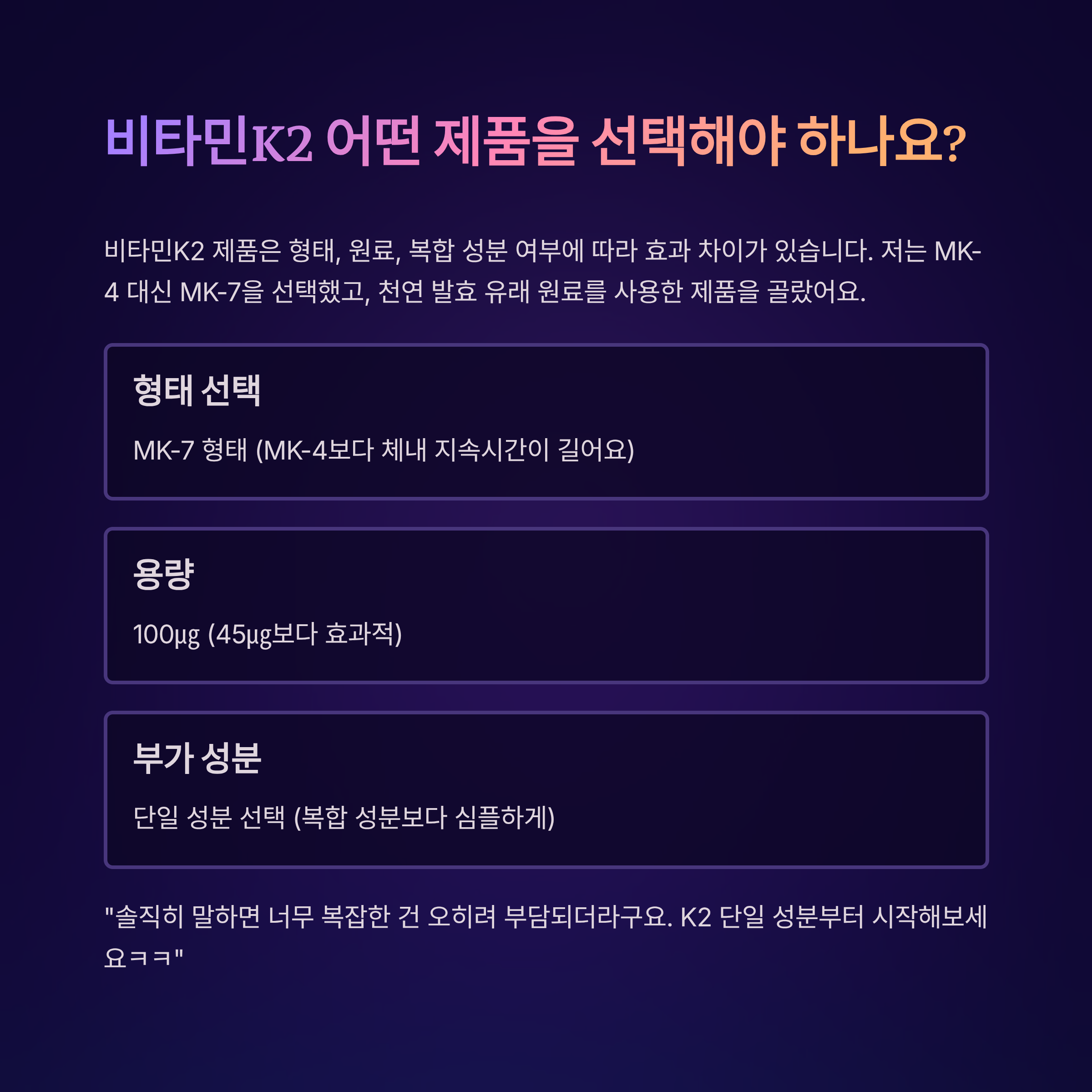 “솔직히 말하면 너무 복잡한 건 오히려 부담되더라구요. K2 단일 성분부터 시작해보세요ㅋㅋ”