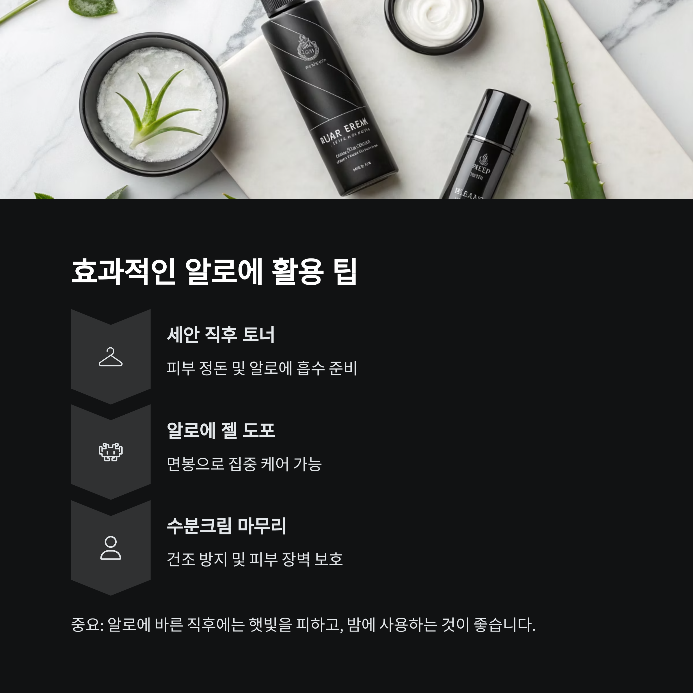 한 가지 더, 알로에 바른 직후에는 절대 햇빛 쬐지 마세요. 외출 전보단 밤에 사용하는 게 안전합니다.