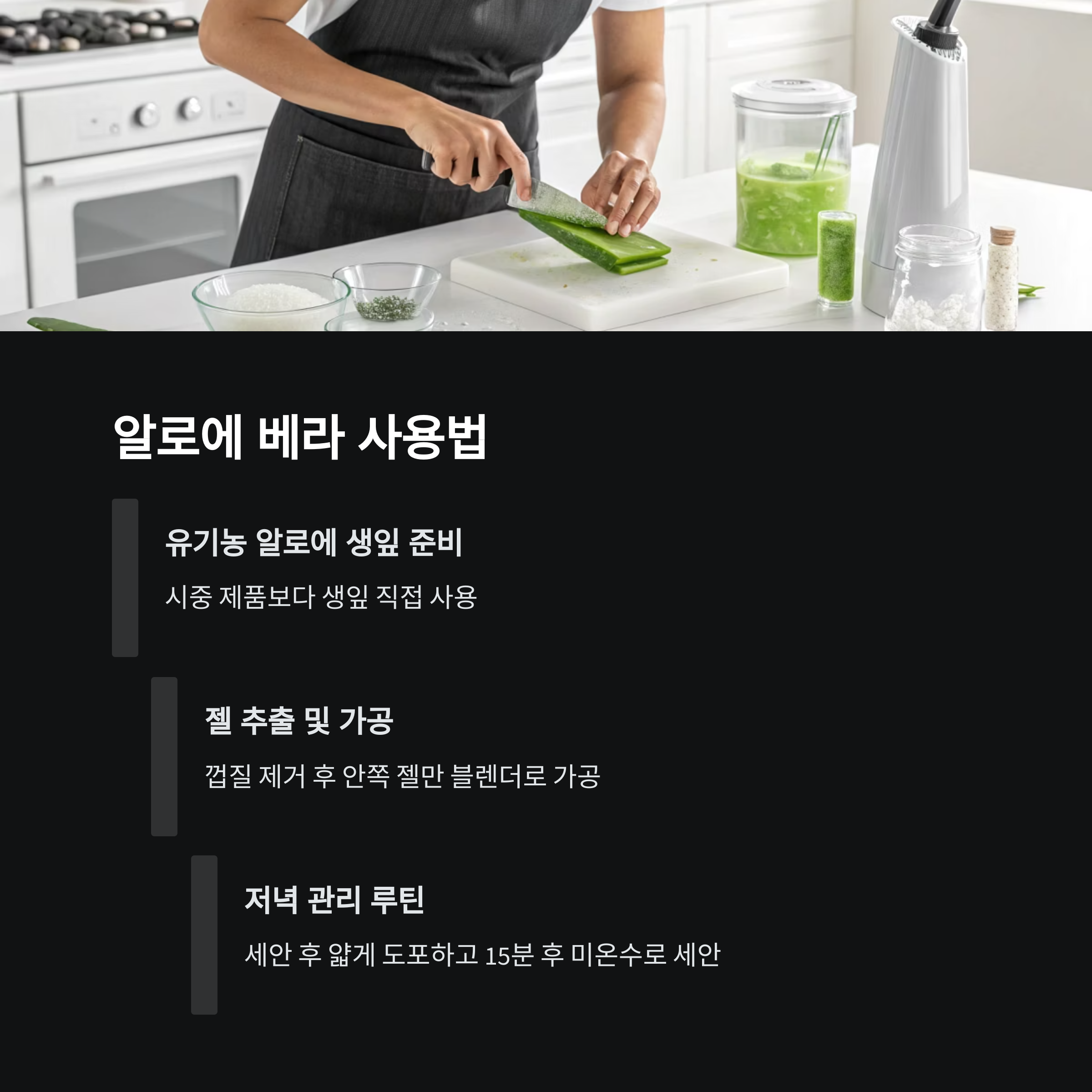 처음엔 생잎을 손질하는 게 번거로웠지만, 익숙해지면 그렇게 어렵지도 않아요. 뿌리 부분을 잘라내고 껍질을 제거한 후 안쪽 젤만 떠서 블렌더에 살짝 돌려 젤 상태로 만든 다음, 깨끗이 세안 후 얼굴에 얇게 도포하고 15분 후에 미온수로 세안했어요.