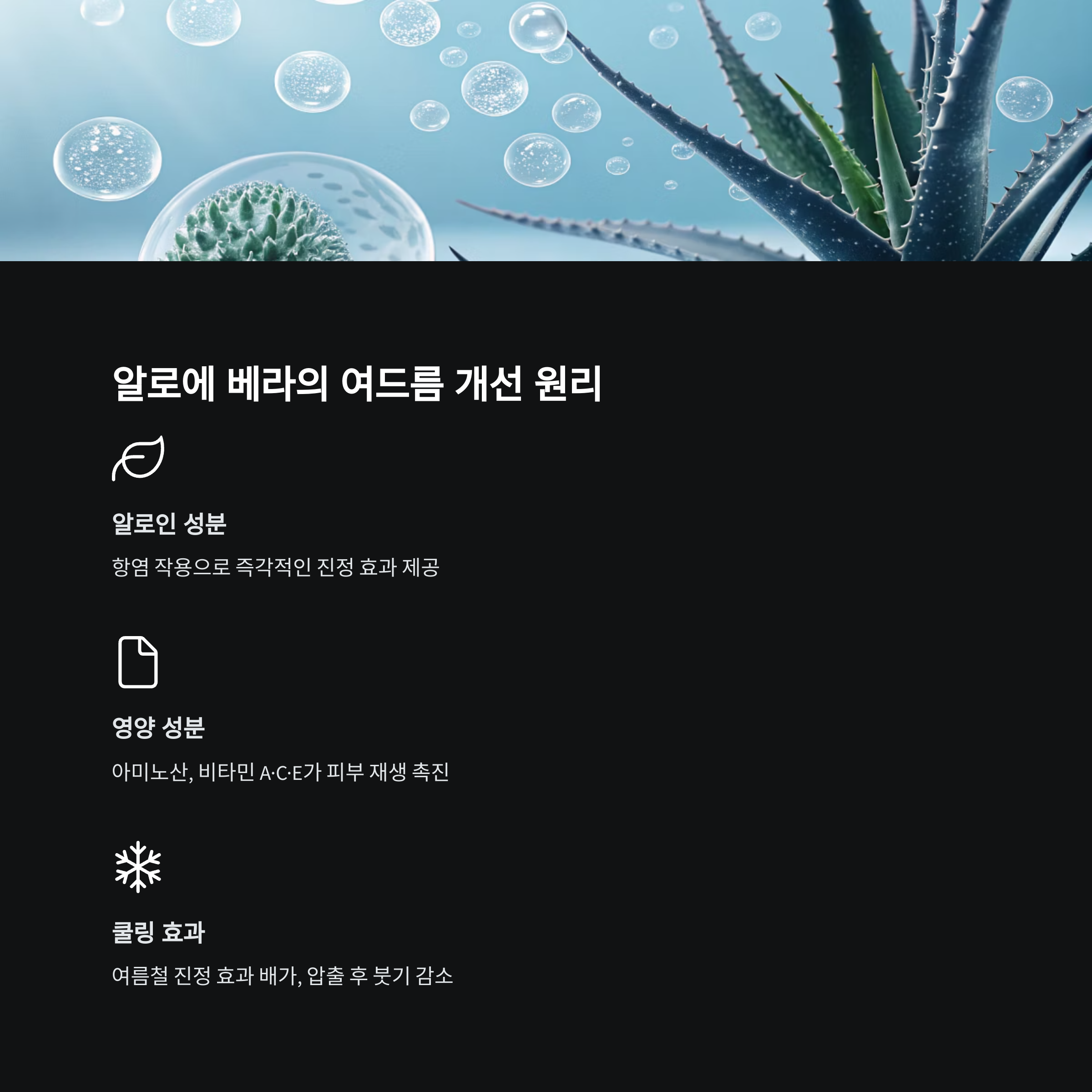 알로에 안에는 ‘알로인’이라는 성분이 있는데, 이게 항염작용을 하더라고요. 그리고 피부를 재생시키는 데 필요한 아미노산, 비타민 A·C·E도 다 들어있어서 피부 회복 속도가 빨라졌어요.