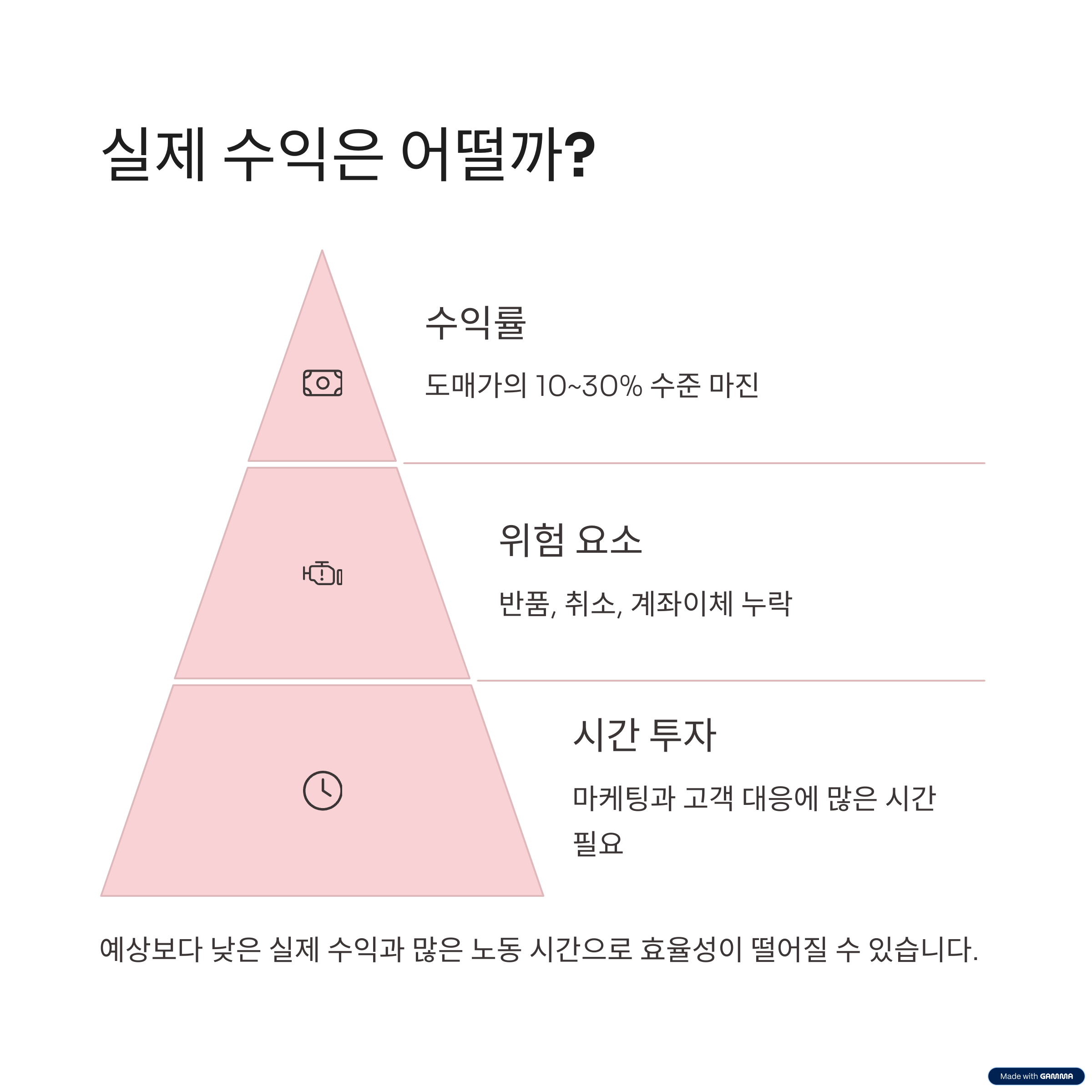 실제로는 반품, 취소, 계좌이체 누락 등의 문제로 예상보다 수익이 낮아지는 경우가 많습니다.