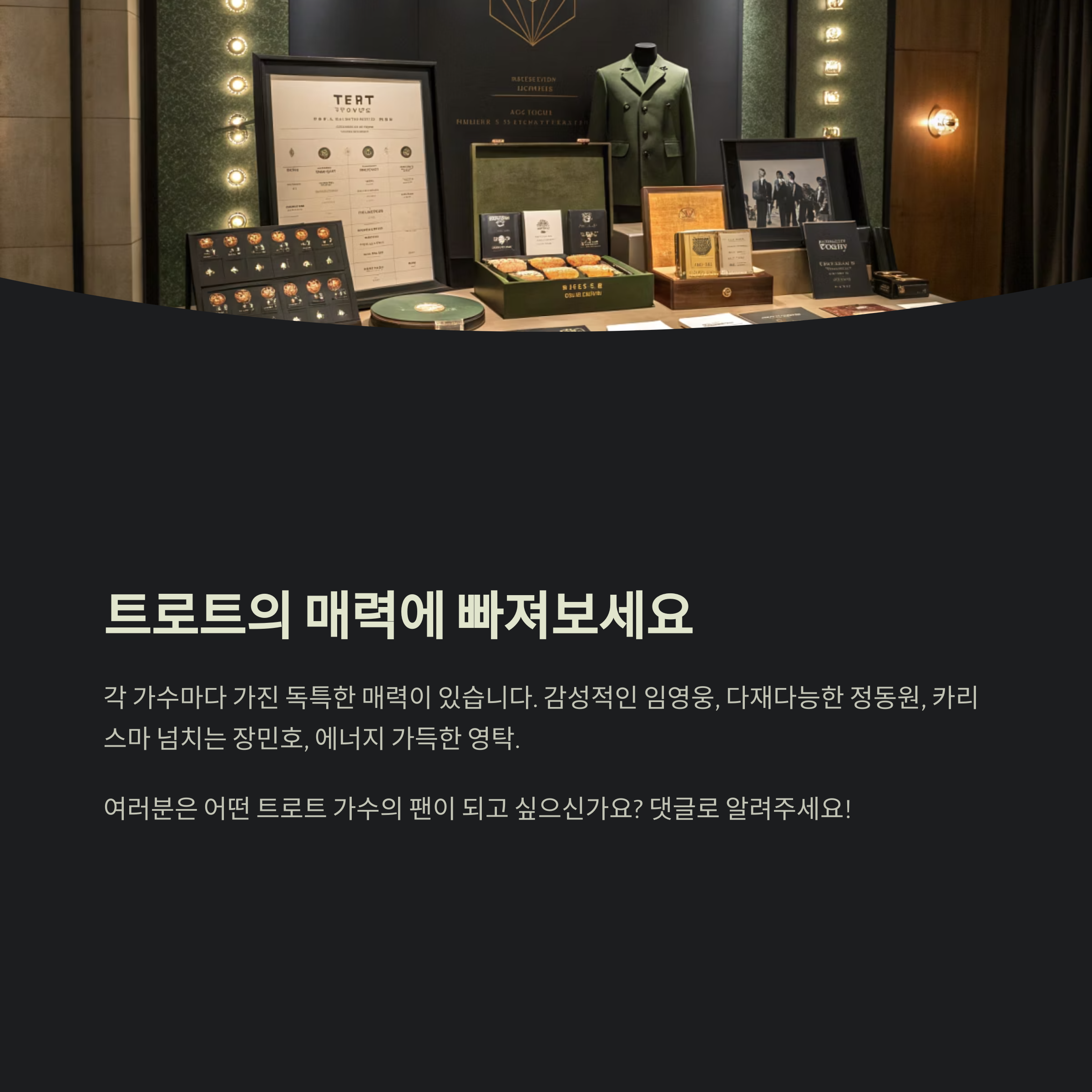 트로트 가수들 중 특히 임영웅, 정동원, 장민호, 영탁 등은 팬덤이 단단하고 충성도가 정말 높습니다. 그런데 왜 이들만 보면 심장이 뛰고, 한 번 보면 빠져들게 되는 걸까요? 직접 공연도 가보고, 유튜브 라이브도 챙겨본 저의 진짜 경험을 바탕으로 매력을 정리해봤습니다. 팬이 되어가는 여정이 궁금하다면, 이 글이 분명 도움이 되실 거예요.