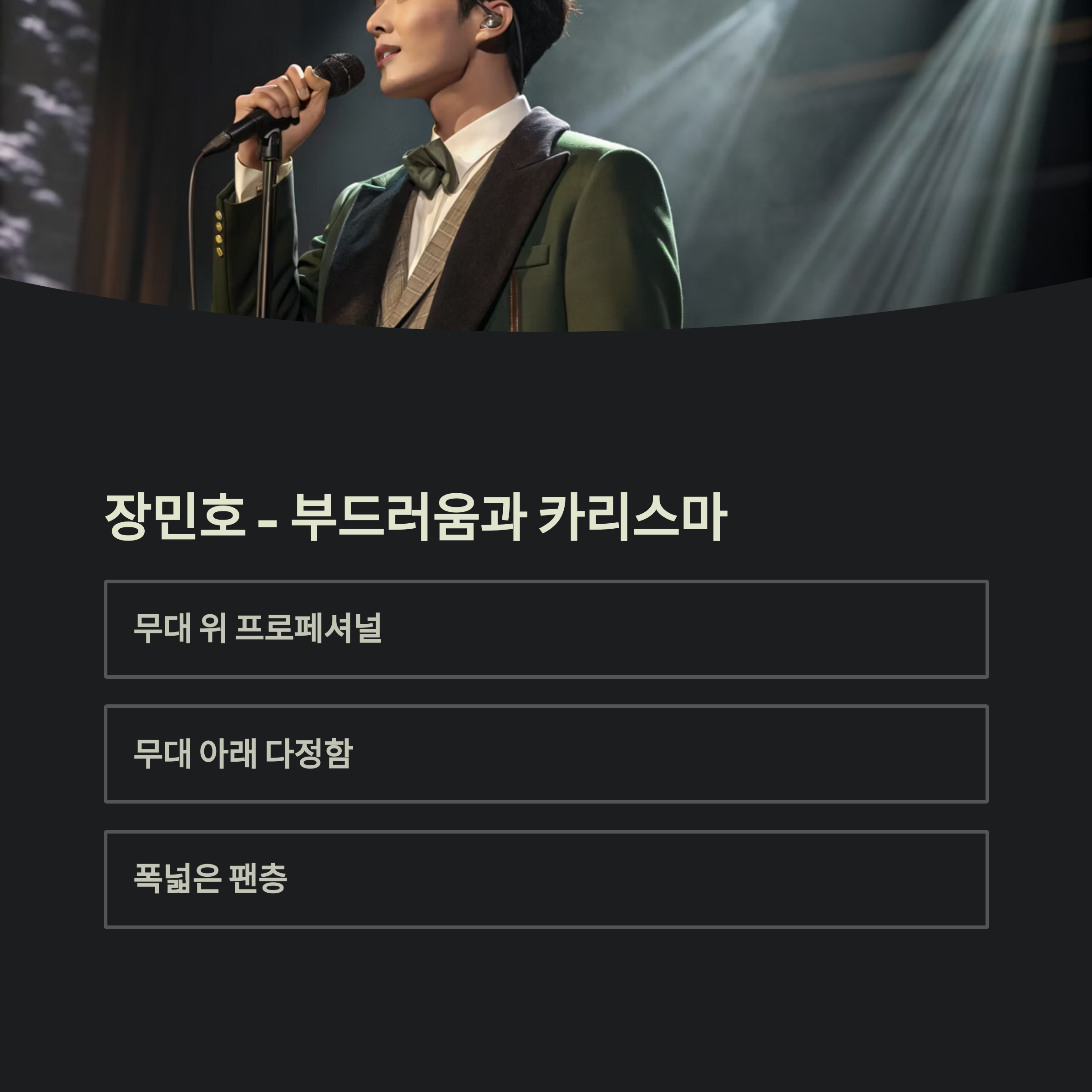 | 장민호 | 부드러움, 성숙함, 무대매너 | 남자는 말합니다, 신사답게 |