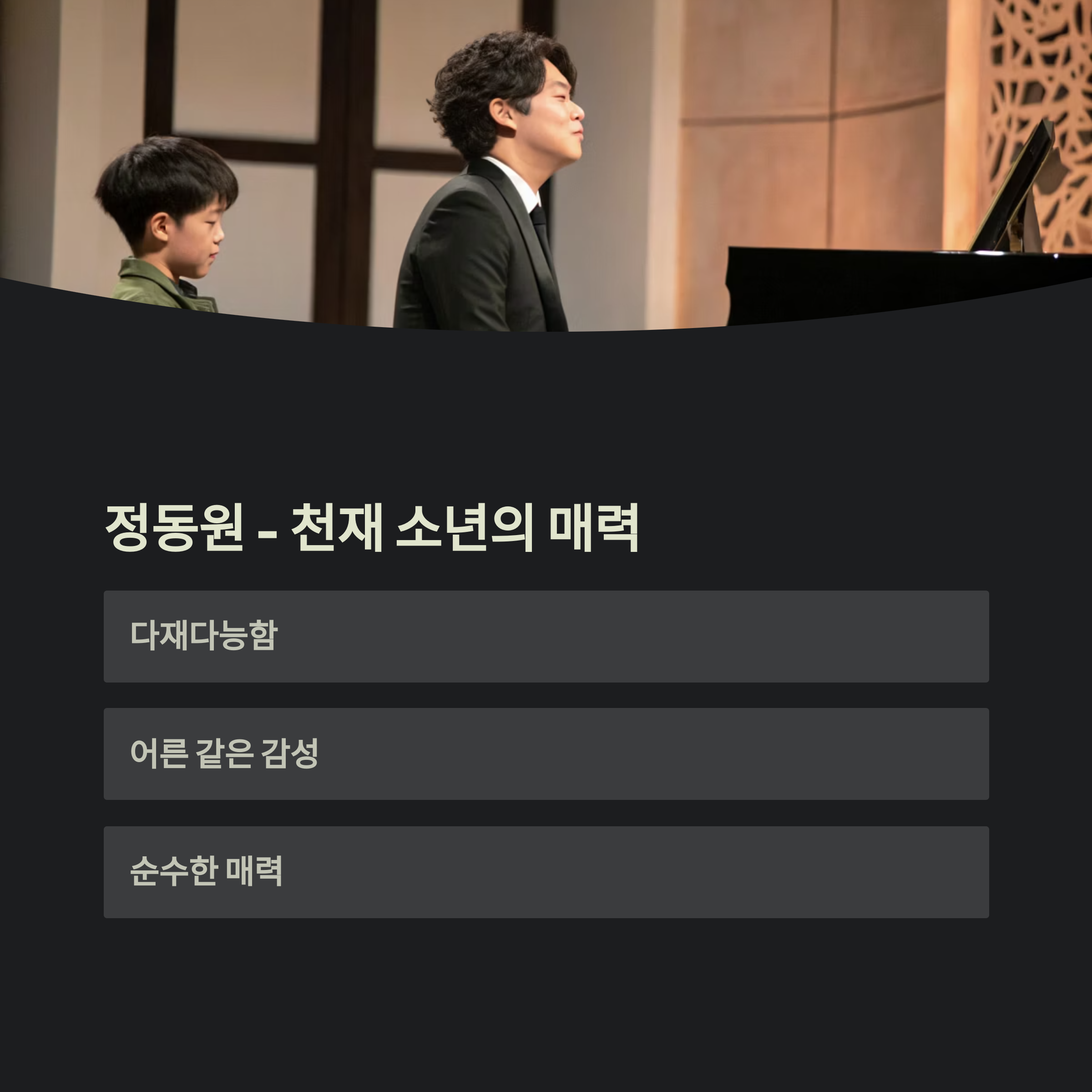 | 정동원 | 순수함, 재능, 감성 표현력 | 청춘, 여백 |