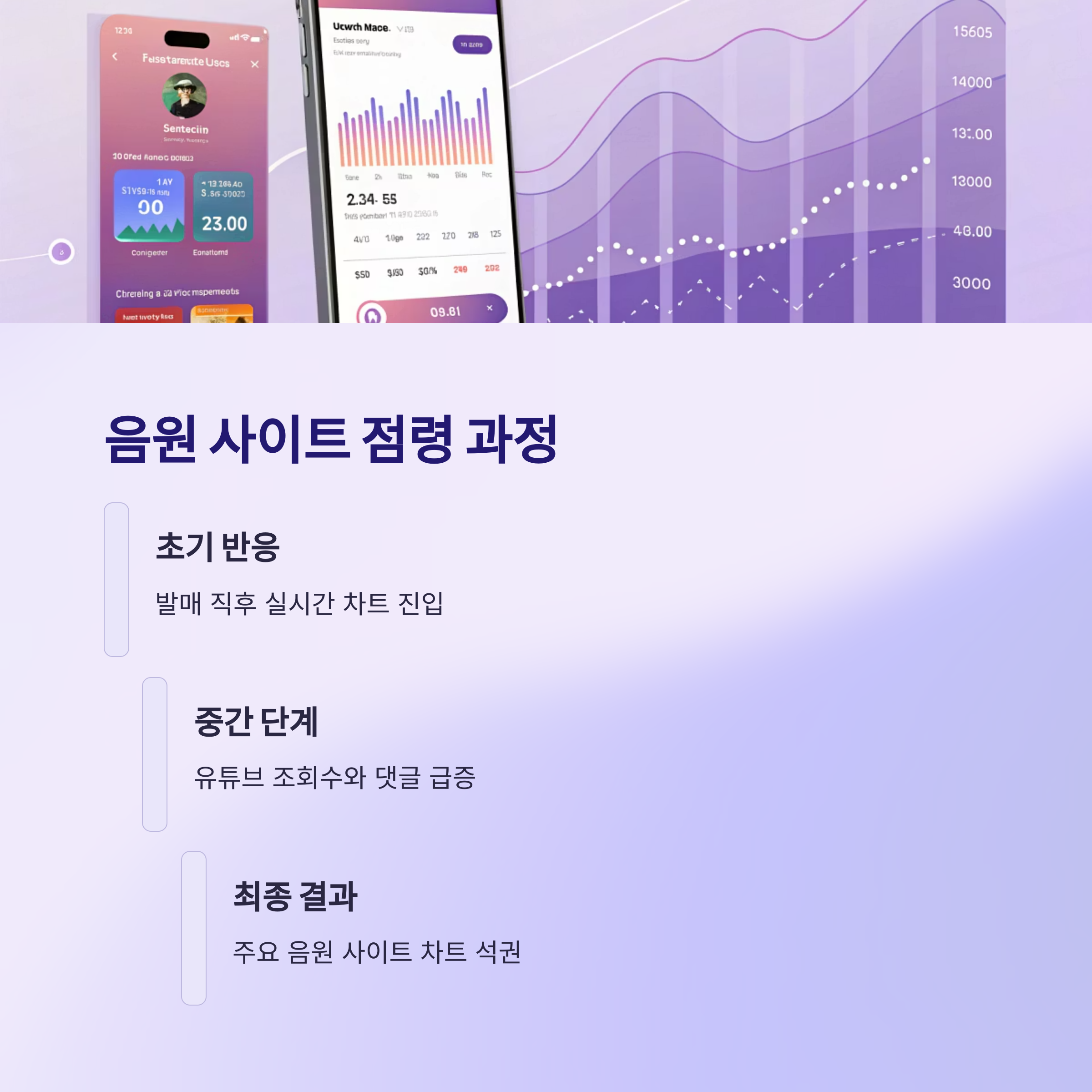 신곡이 나오자마자 저는 멜론, 벅스, 지니를 거의 동시에 열어서 차트를 확인했습니다. 15분 단위로 실시간 차트가 반영되기 때문에 새벽 1시부터는 1분 단위로 새로고침을 누르며 지켜봤어요. 재밌는 건요, 유튜브 음원 영상은 당일 1시간만에 조회수 30만을 찍었고, 댓글이 4천 개 가까이 달렸습니다. 그 중에는 "지금 멜론도 뚫렸어요ㅋㅋ", "벅스는 이미 1위임"이라는 인증이 줄줄이 올라왔고요.