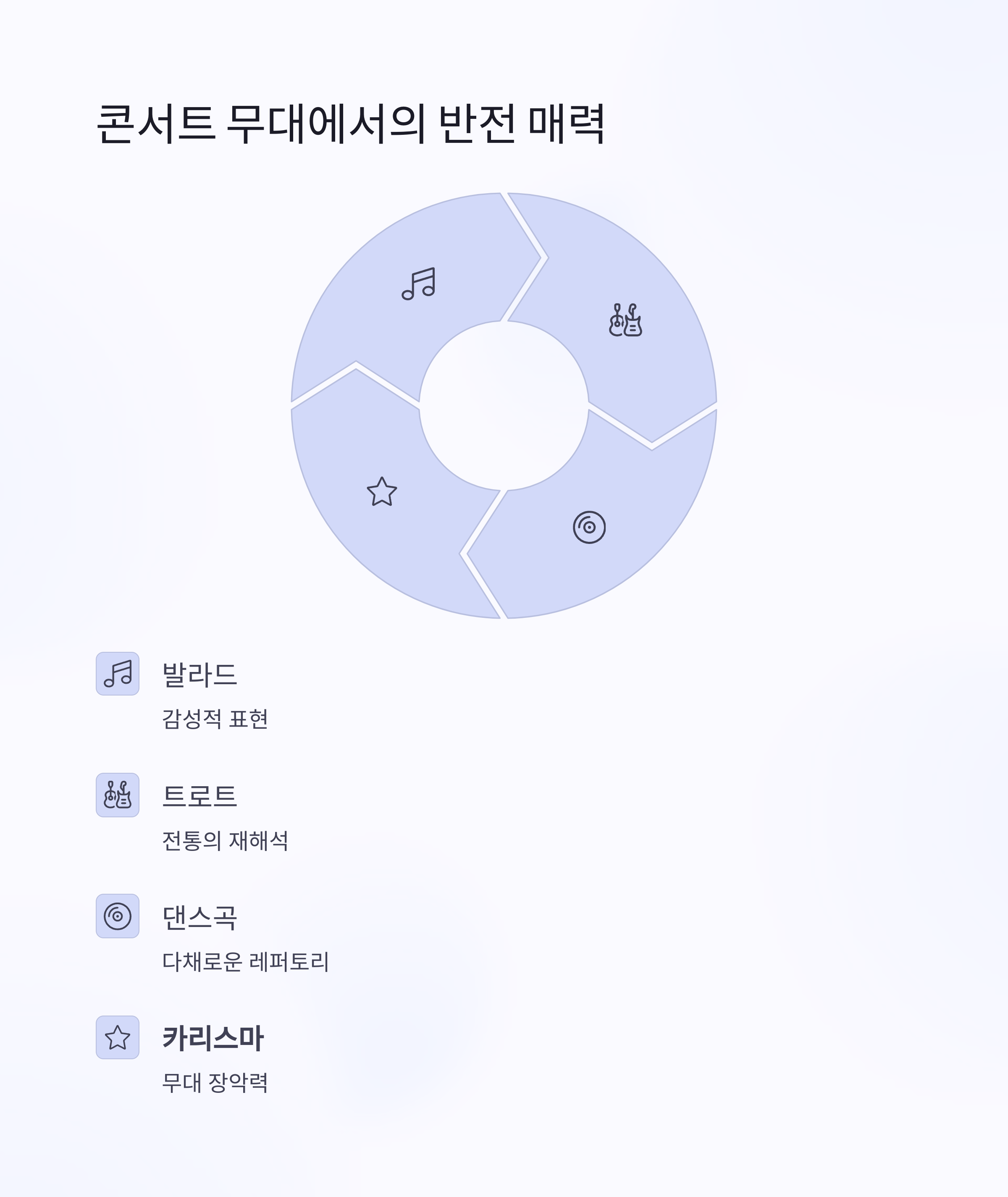 | 콘서트 무대 | 전국 투어 단독 콘서트 | 다양한 장르 소화 |