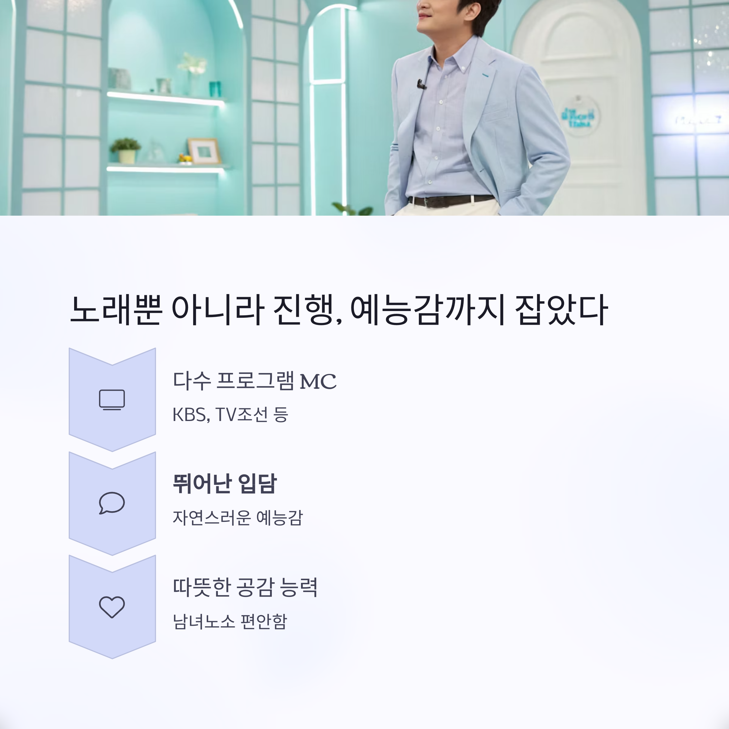 | 예능 진행 | 불후의 명곡 MC | 차분하고 센스 있는 진행 |