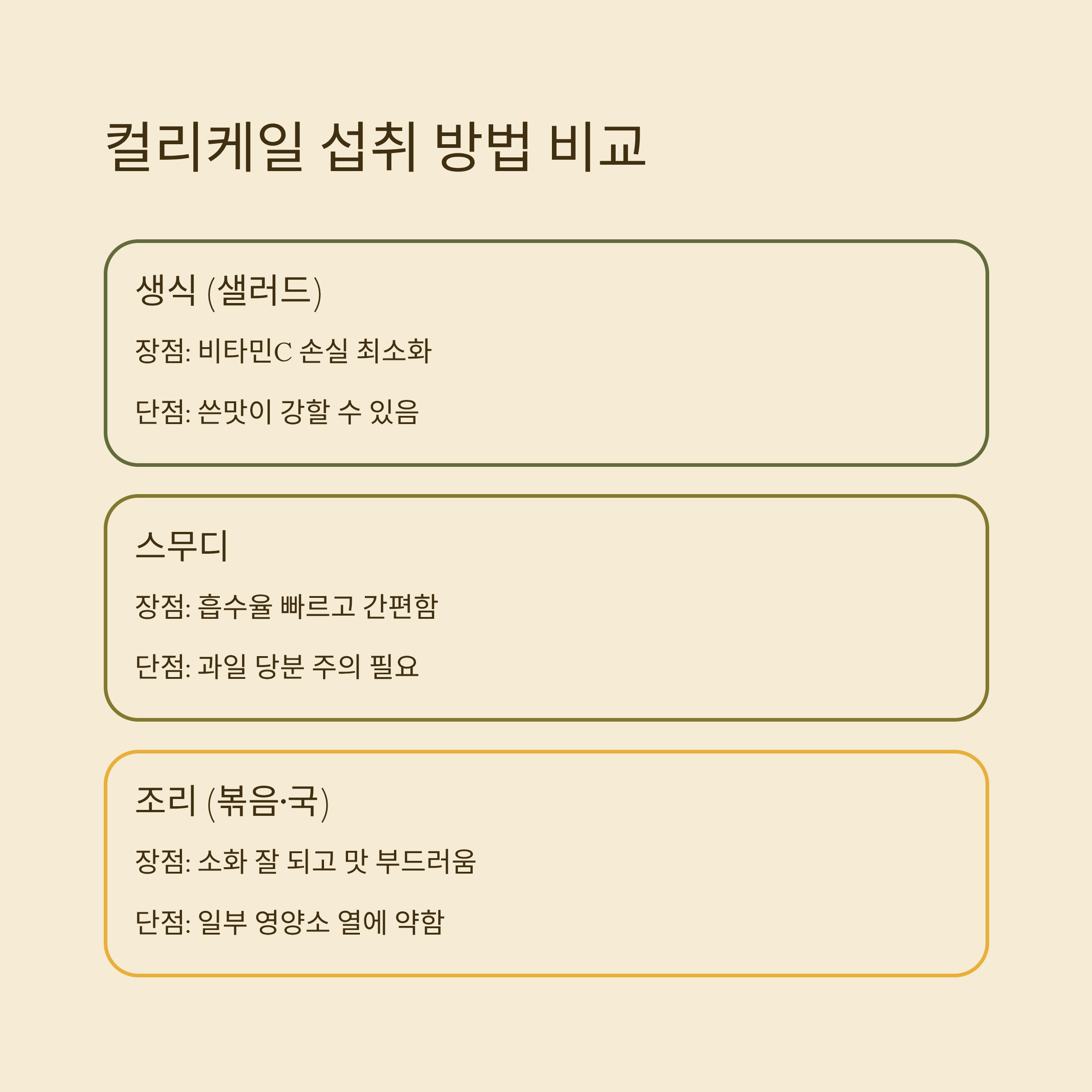 | 생식(샐러드) | 비타민C 손실 최소화 | 쓴맛이 강할 수 있음 |