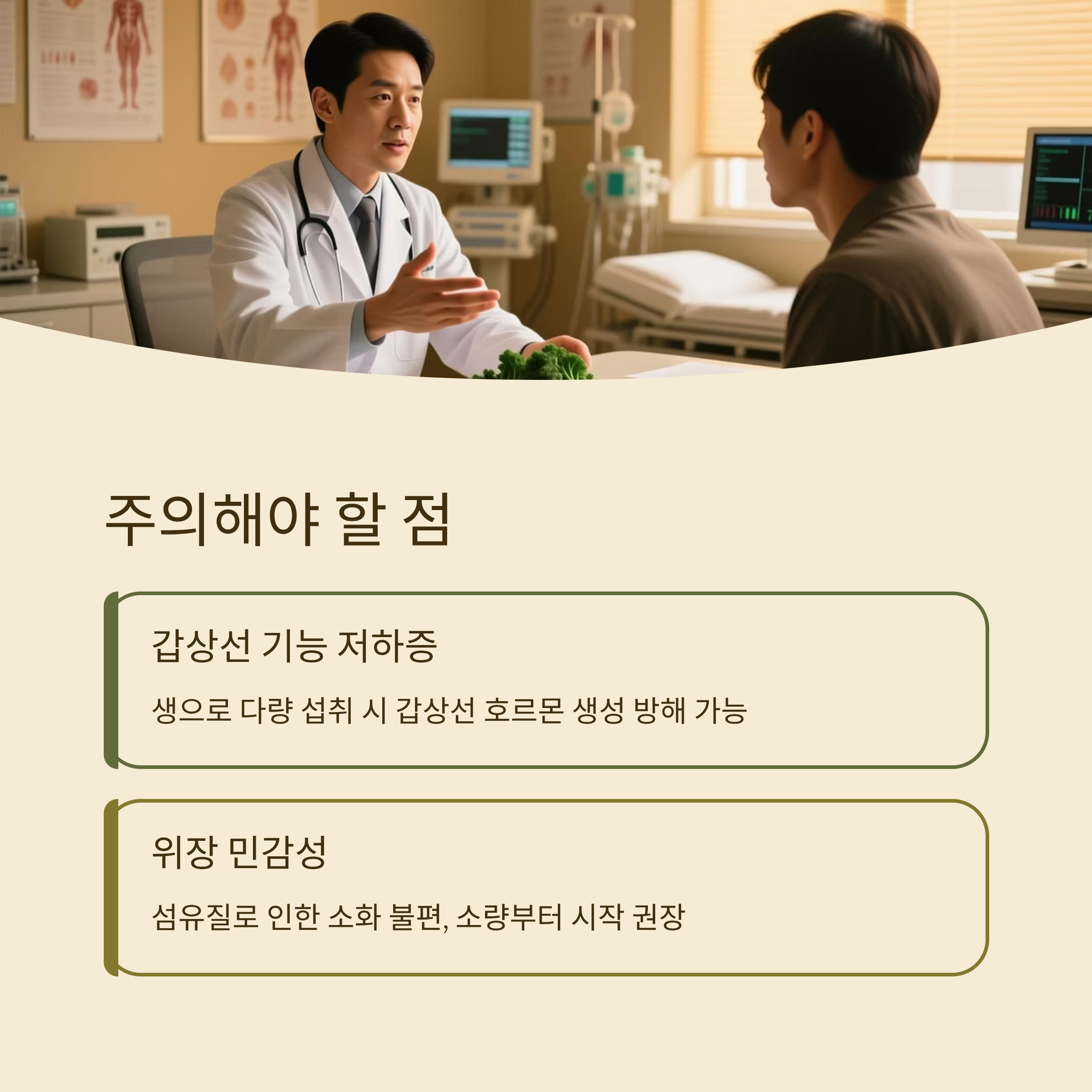 좋은 효능에도 불구하고 모든 사람에게 맞는 것은 아닙니다. 갑상선 기능 저하증 환자는 생으로 다량 섭취 시 문제가 될 수 있으므로 조리 후 섭취가 안전합니다. 또 위장이 약한 사람은 섬유질 때문에 더부룩할 수 있으니 소량부터 시작하는 것이 좋습니다. 저도 초반에는 조금 속이 불편했지만 조리 방식을 바꾸니 문제없이 지속할 수 있었습니다.