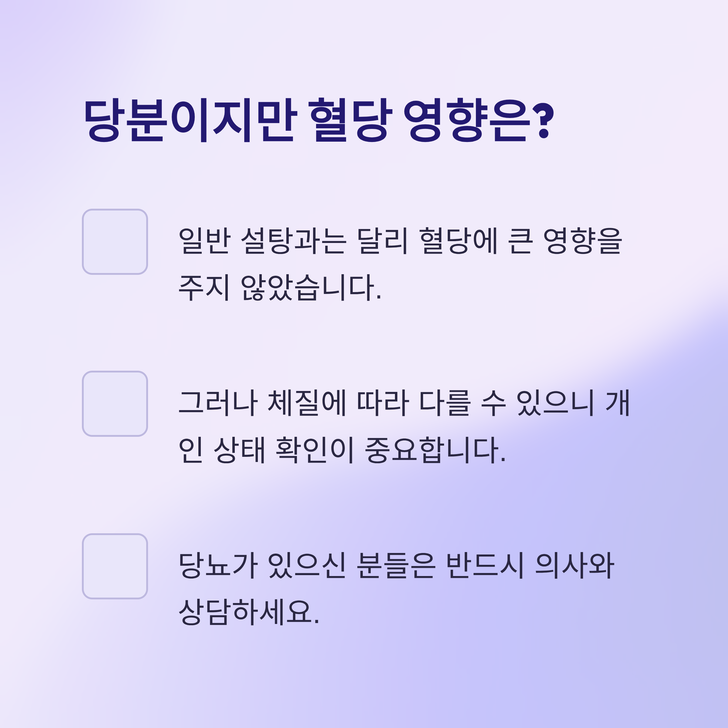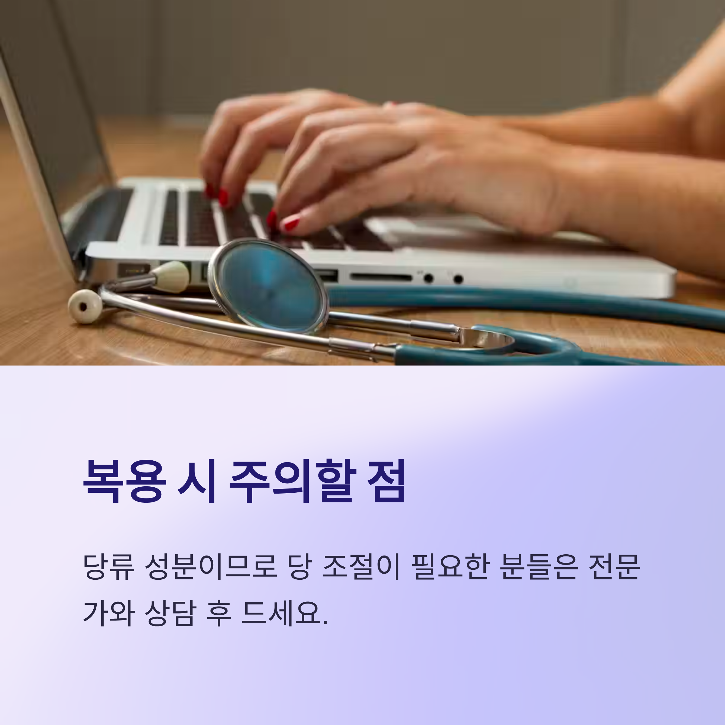 모든 사람에게 무조건 좋을 수는 없습니다. 당류 성분이기 때문에 당 조절이 필요한 분이나 특정 대사 질환이 있는 분들은 반드시 전문가와 상담 후 드시는 게 맞습니다. 저도 처음에는 설탕 같은 당분이 아닐까 걱정했는데, 실제로 혈당에 큰 영향을 주지 않았습니다. 하지만 체질에 따라 다를 수 있으니 무작정 복용하기보다는 스스로 몸 상태를 확인하는 게 중요합니다.