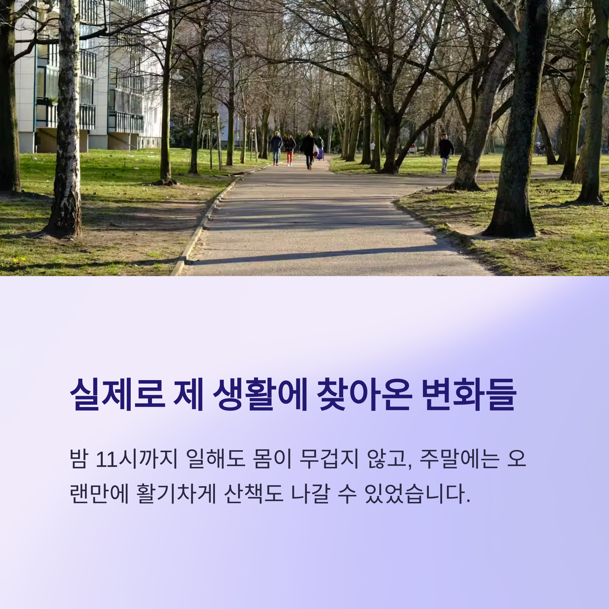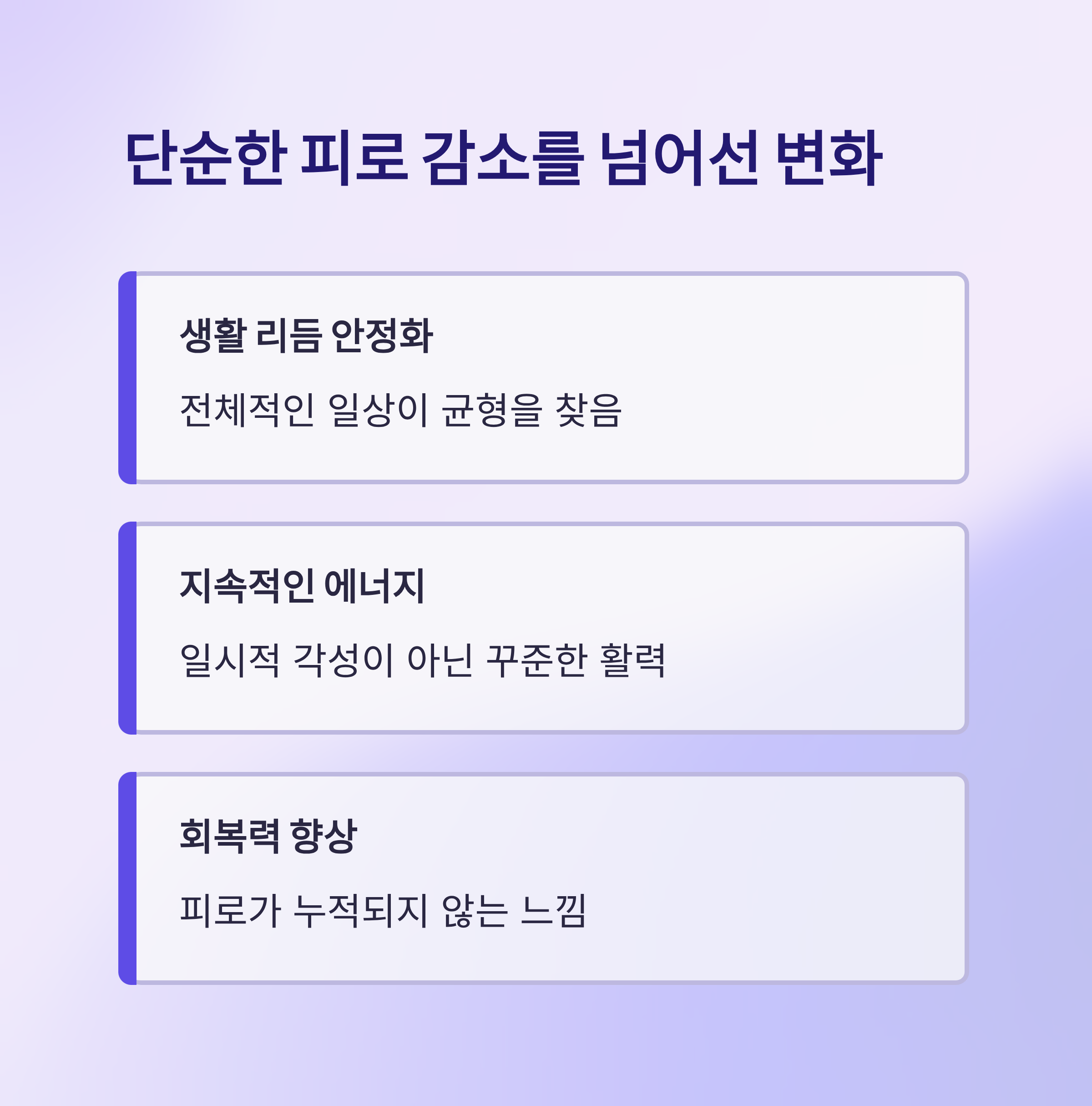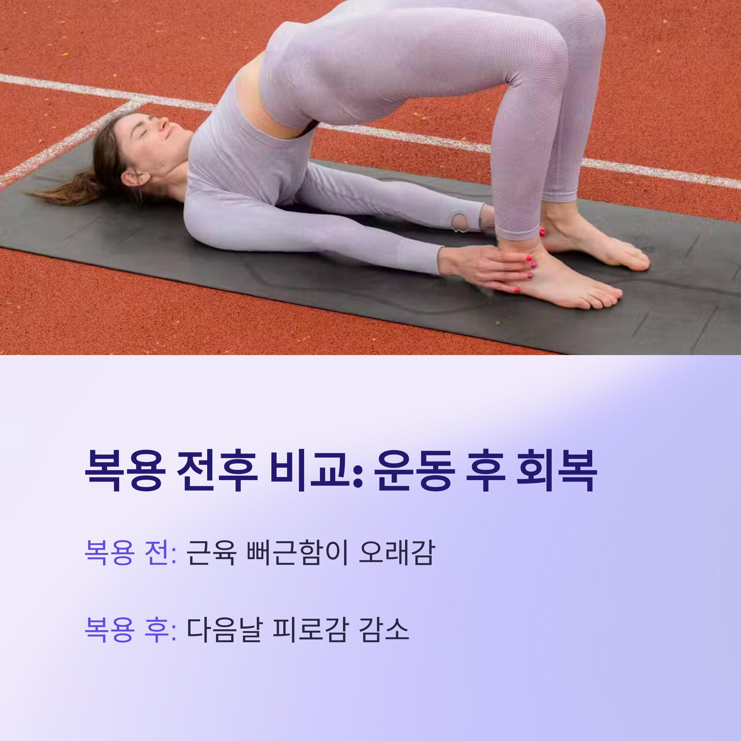 | 운동 후 회복 | 근육 뻐근함 오래감 | 다음날 피로감 덜함 |