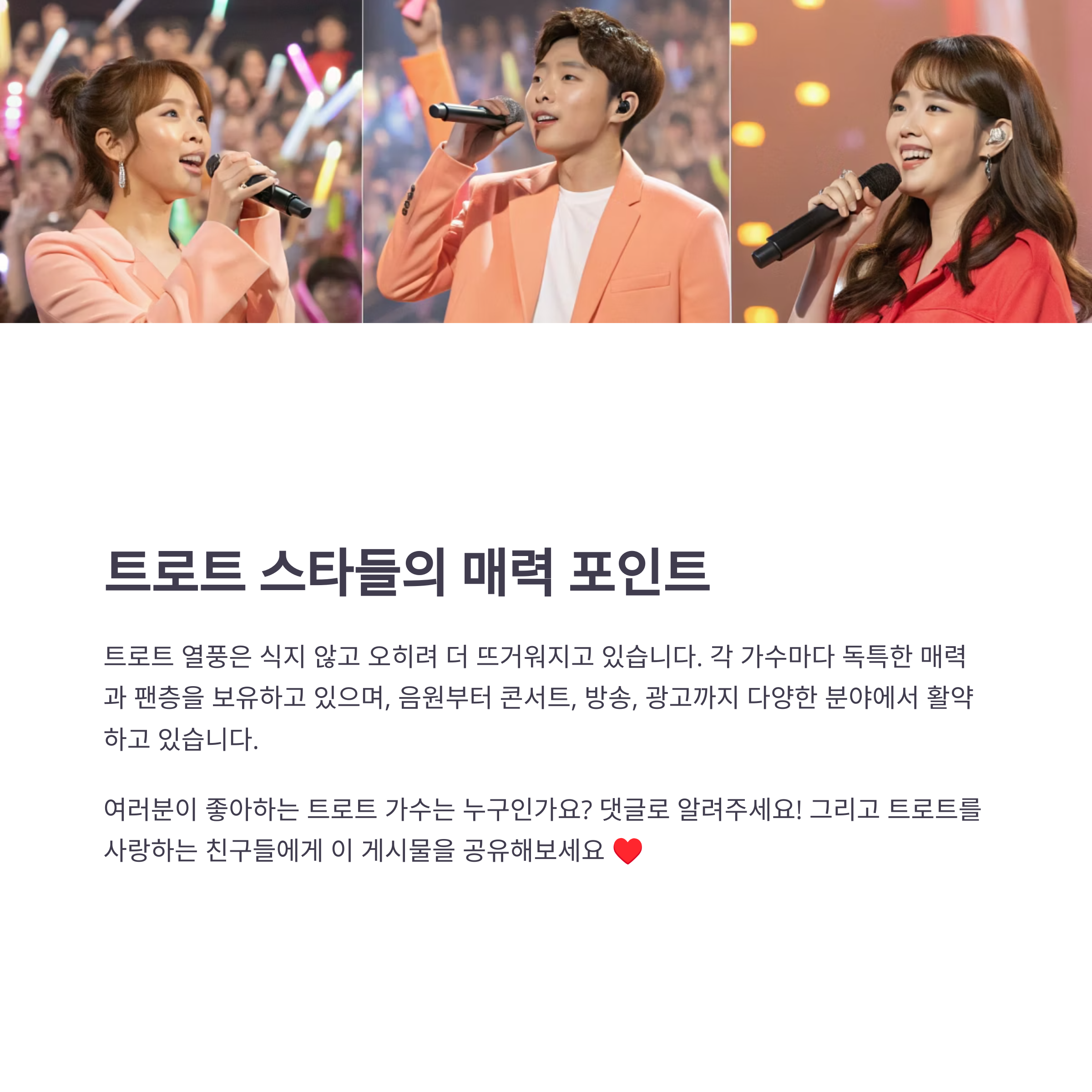 트로트 열풍, 한동안 지나갔다 싶었는데… 오히려 더 뜨거워졌죠. 팬덤도 어마어마하고 방송, 콘서트, 광고까지 장악한 스타들도 속출 중이에요. 그런데 진짜 궁금한 건 ‘지금 당장 인기 많은 트로트 가수’가 누군가 하는 거잖아요. 팬카페 순위, 유튜브 조회수, 방송 노출 빈도까지 다 따져본 제 실제 경험을 기준으로 지금 가장 핫한 트로트 가수 순위를 알려드릴게요.