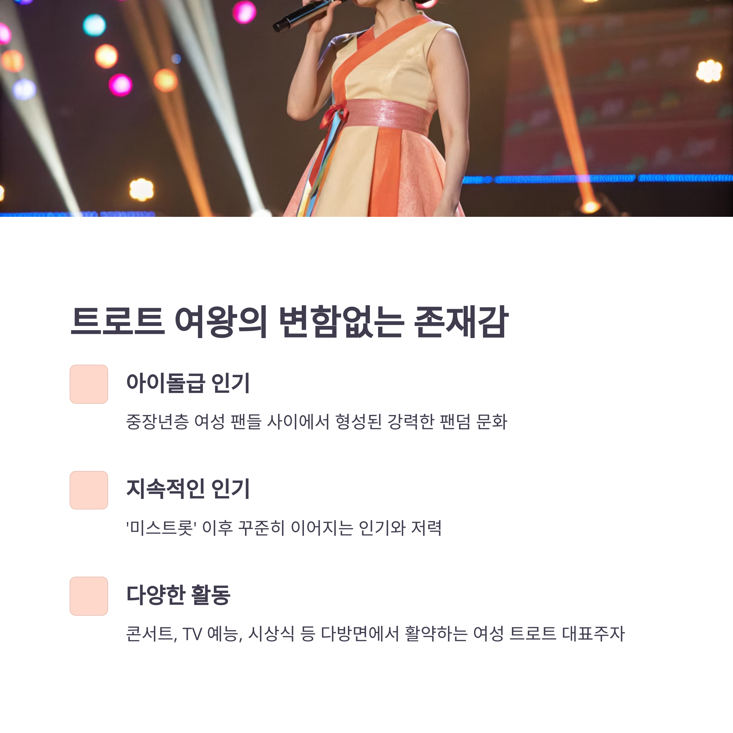 ‘미스트롯’ 1기부터 시작된 인기가 지금까지도 이어지는 걸 보면, 진짜 대단한 저력 같아요. 콘서트뿐 아니라 TV 예능, 시상식에서도 꾸준히 볼 수 있는 유일한 여성 트로트 가수 아닐까 싶어요.