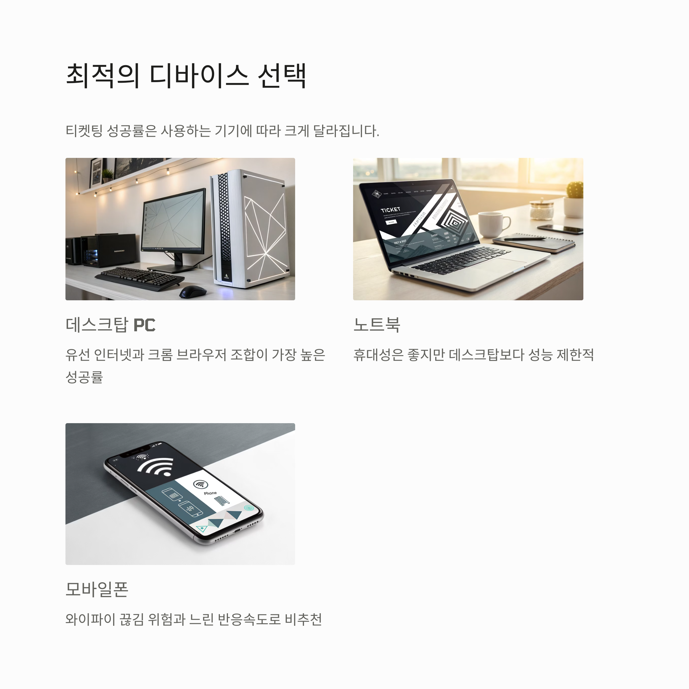 핸드폰은 와이파이 끊김이 많고, 반응속도도 늦더라고요. 고사양 PC일수록 티켓팅에 유리한 건 확실합니다.