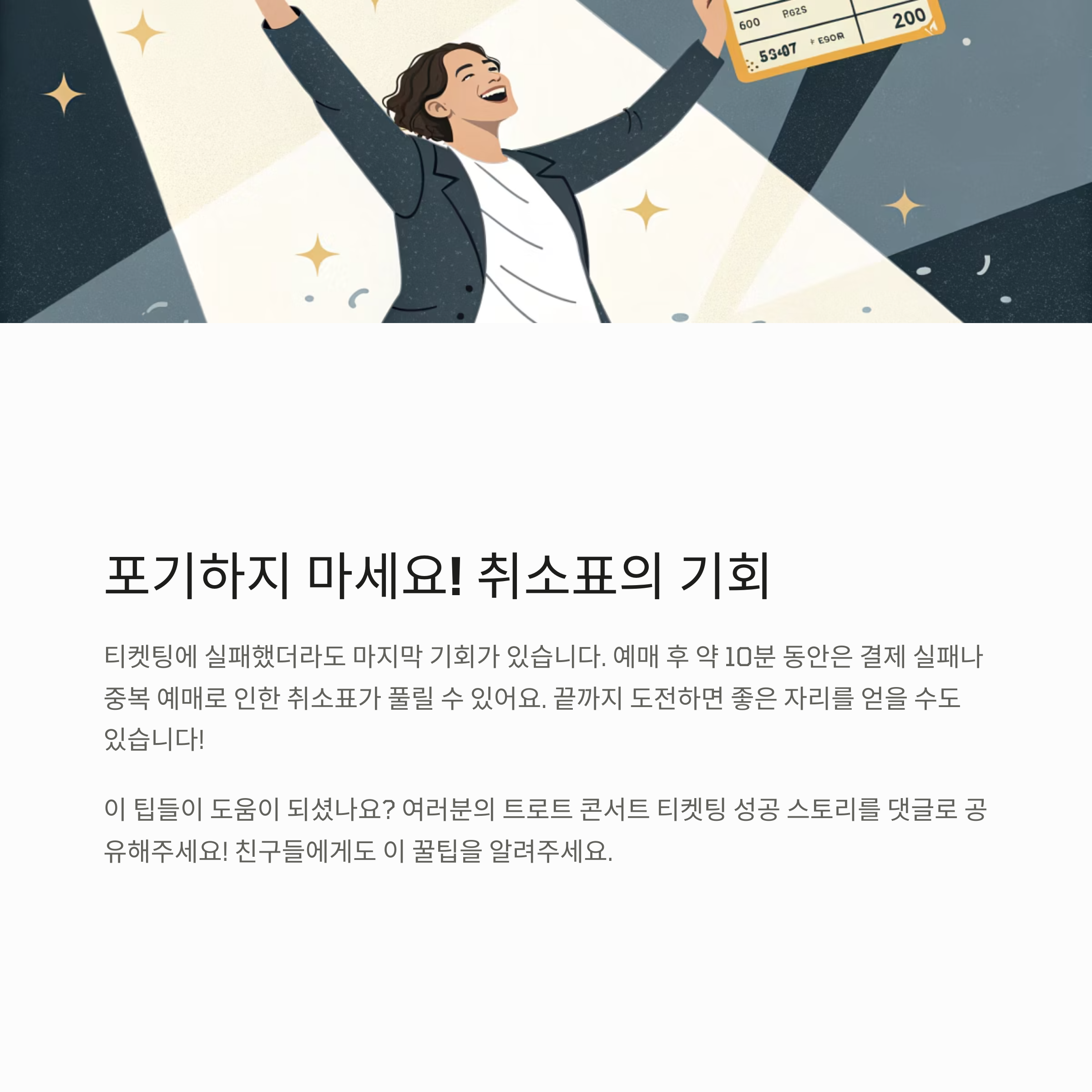 티켓팅에 실패해도 포기하면 안 돼요. 예매 후 10분 내에 결제 실패나 중복 예매로 풀리는 취소표가 꽤 많거든요.