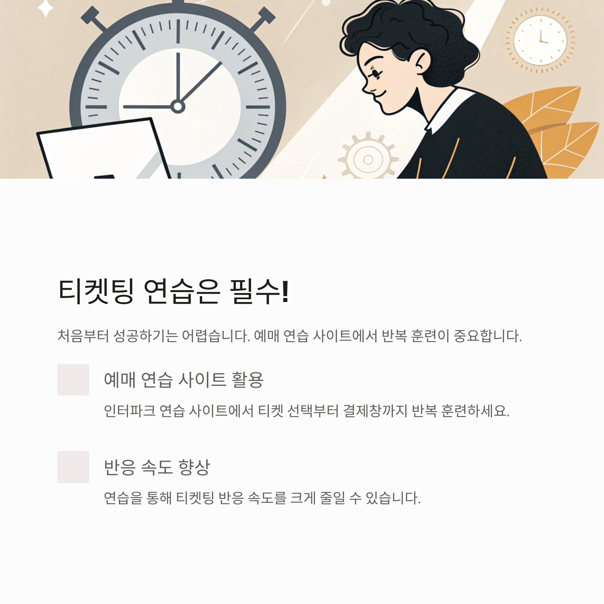 저는 ‘인터파크 연습 사이트’에서 티켓 선택 > 좌석 선택 > 결제창까지 반복 훈련했는데, 진짜 티켓팅 반응속도 3초는 줄었습니다.