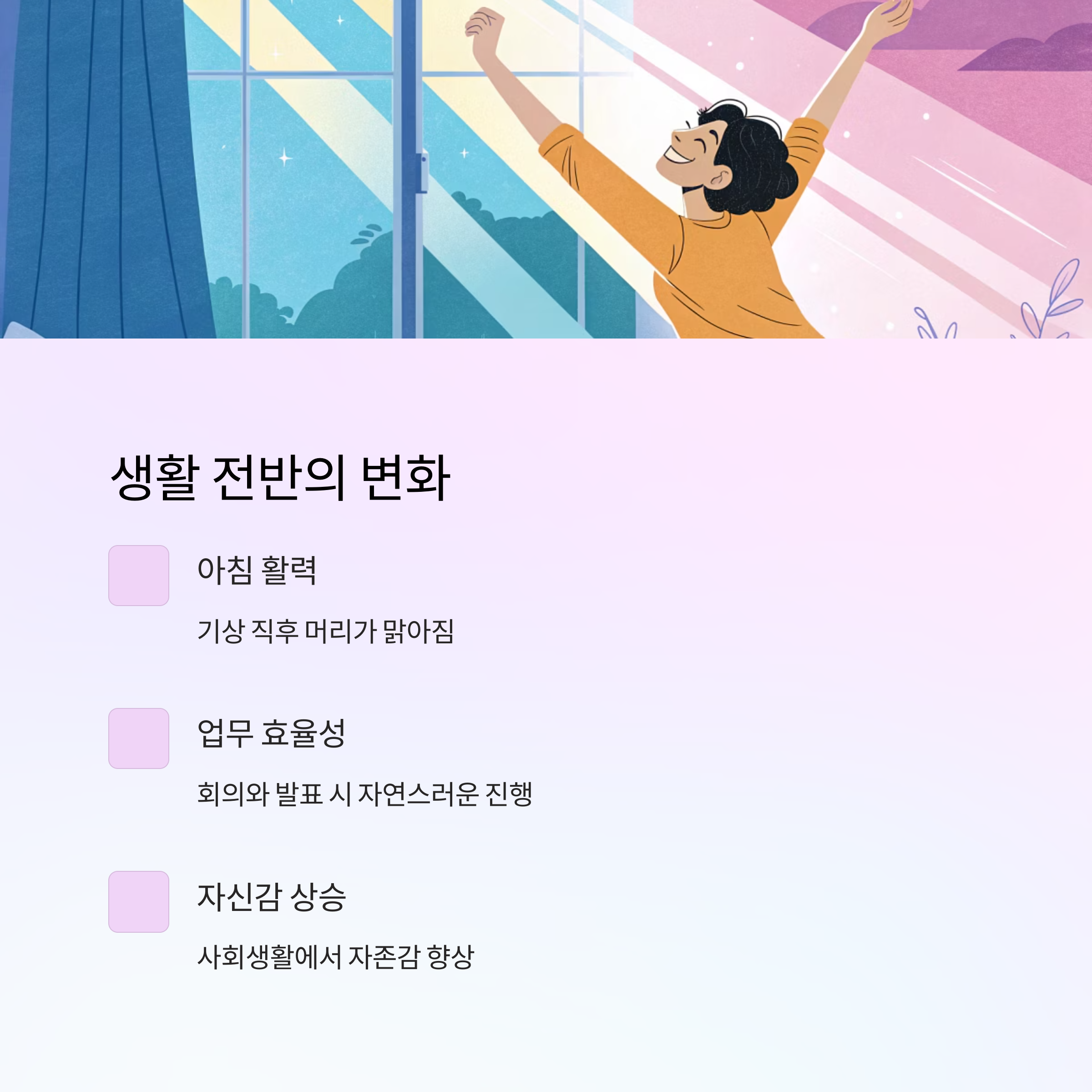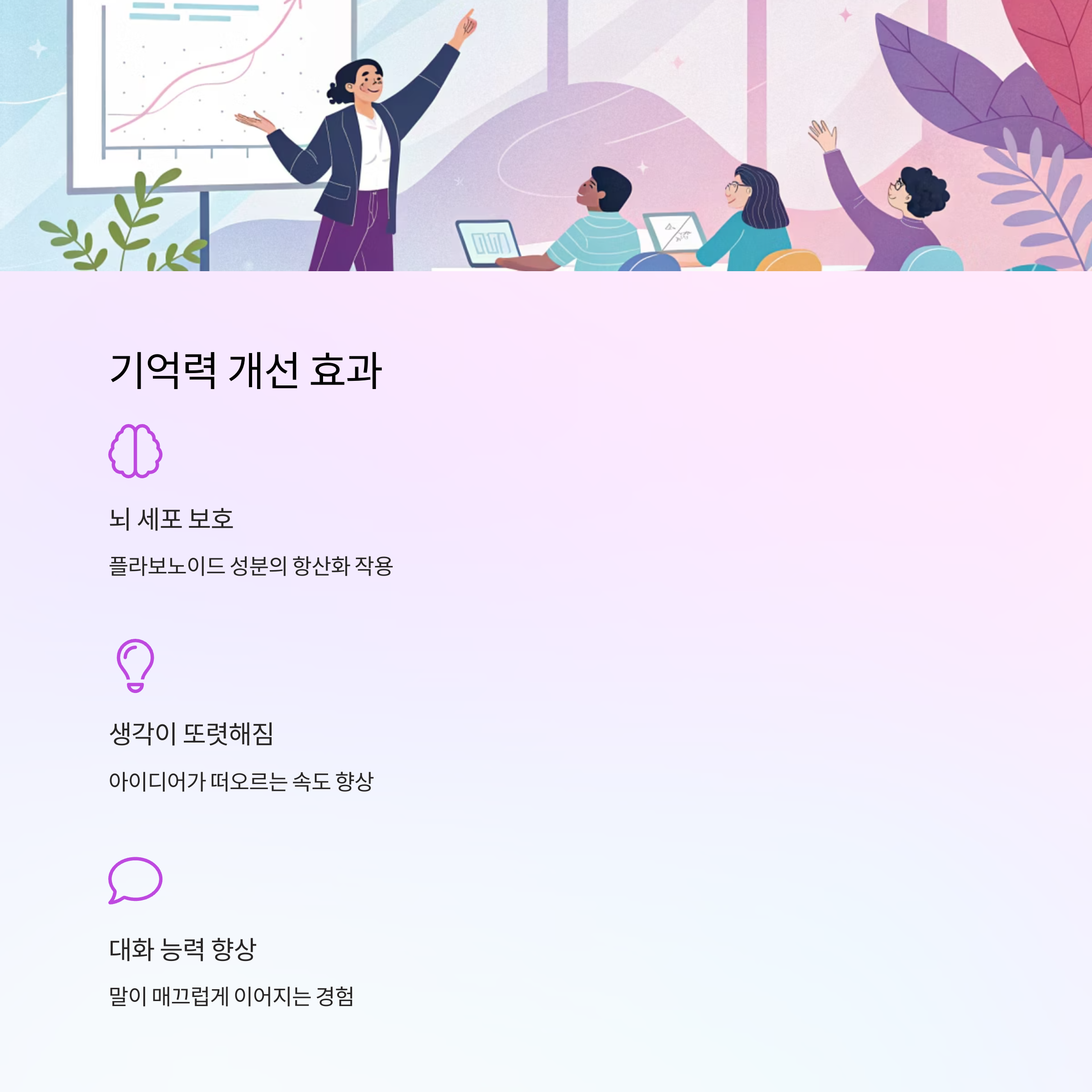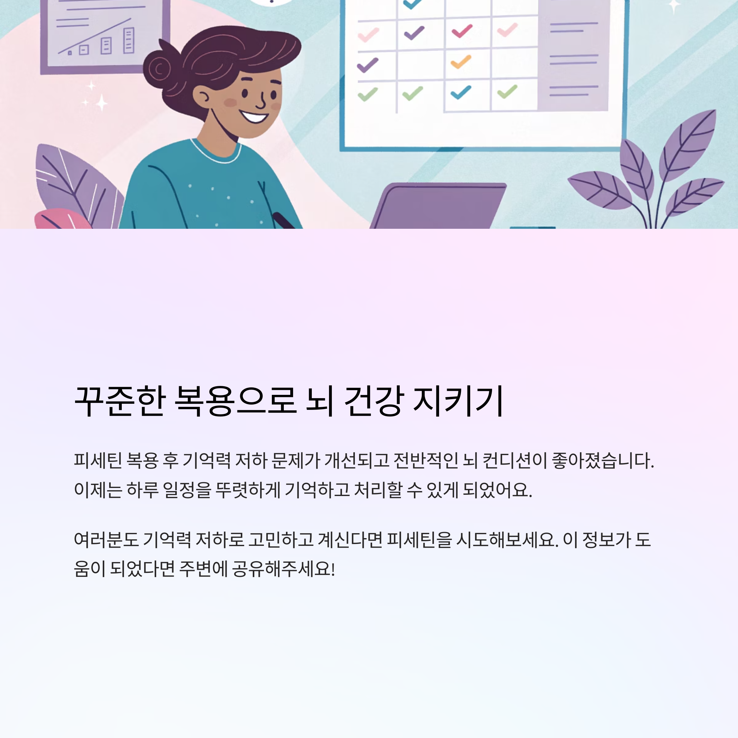 기억력 저하 문제뿐 아니라, 전반적인 뇌 컨디션이 좋아진 느낌이에요. 예전에는 멍하게 있다가 중요한 걸 까먹는 일이 잦았다면, 지금은 하루 일정을 뚜렷하게 기억하고 처리할 수 있게 되었어요.