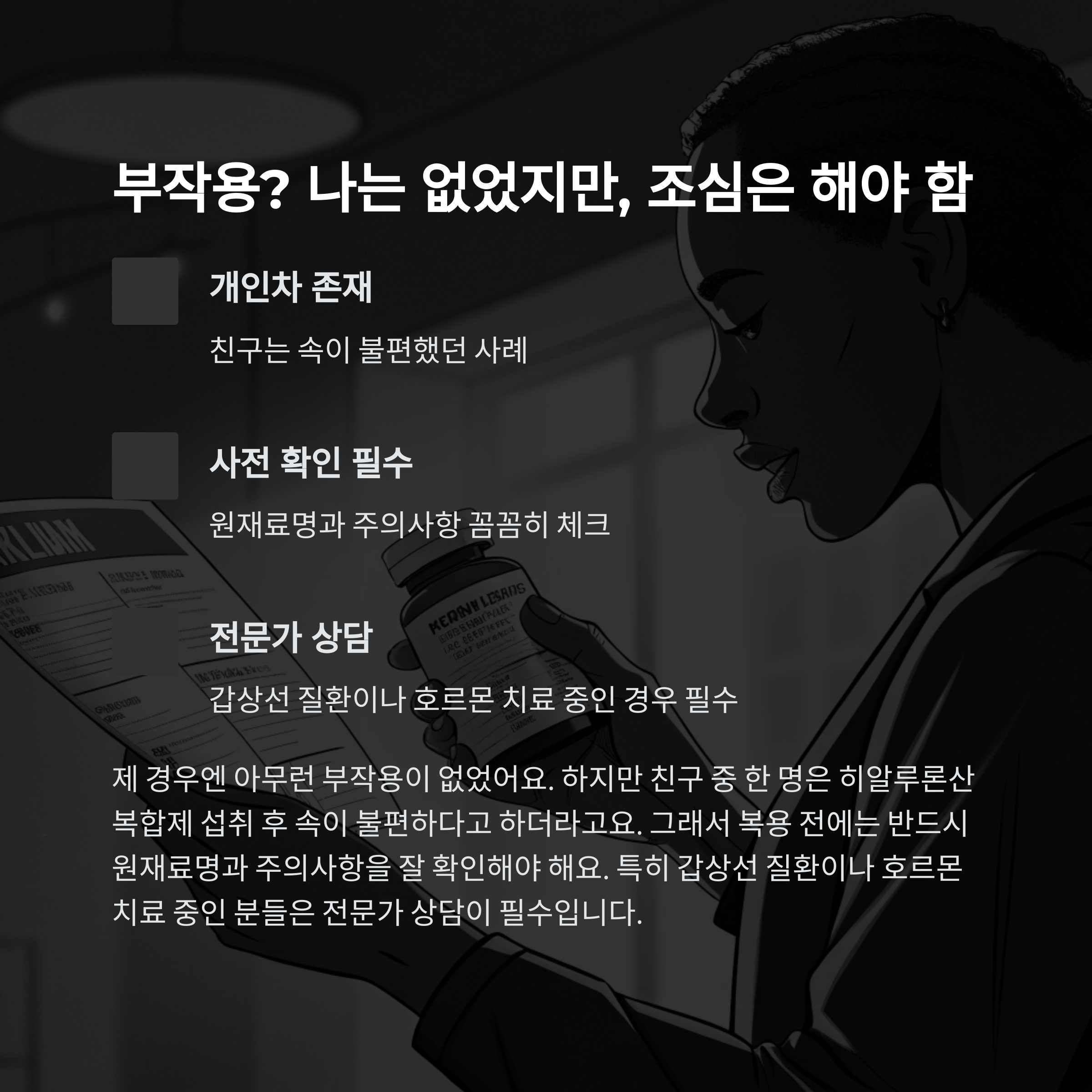 하지만 친구 중 한 명은 히알루론산 복합제 섭취 후 속이 불편하다고 하더라고요.