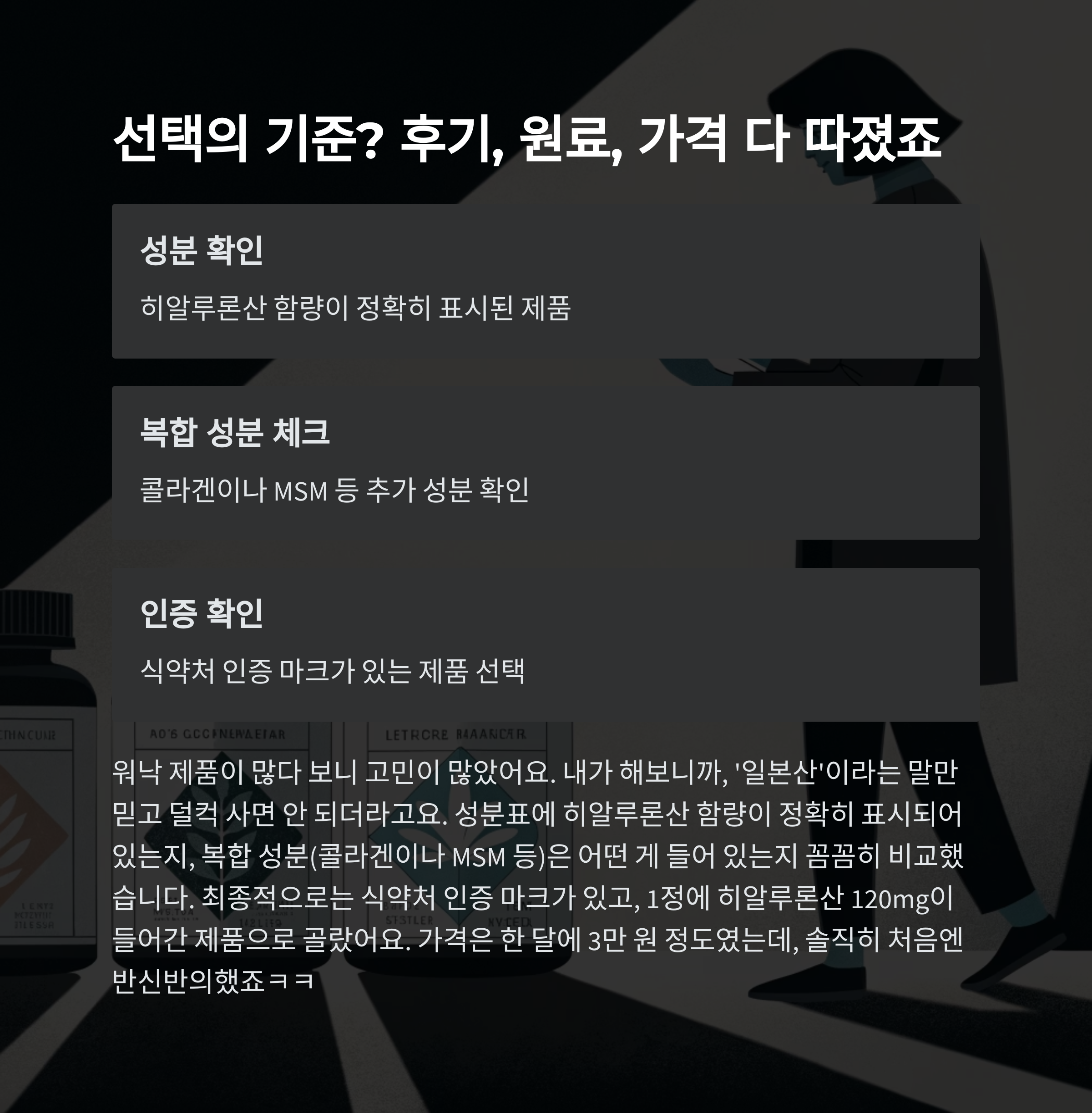 성분표에 히알루론산 함량이 정확히 표시되어 있는지, 복합 성분(콜라겐이나 MSM 등)은 어떤 게 들어 있는지 꼼꼼히 비교했습니다.