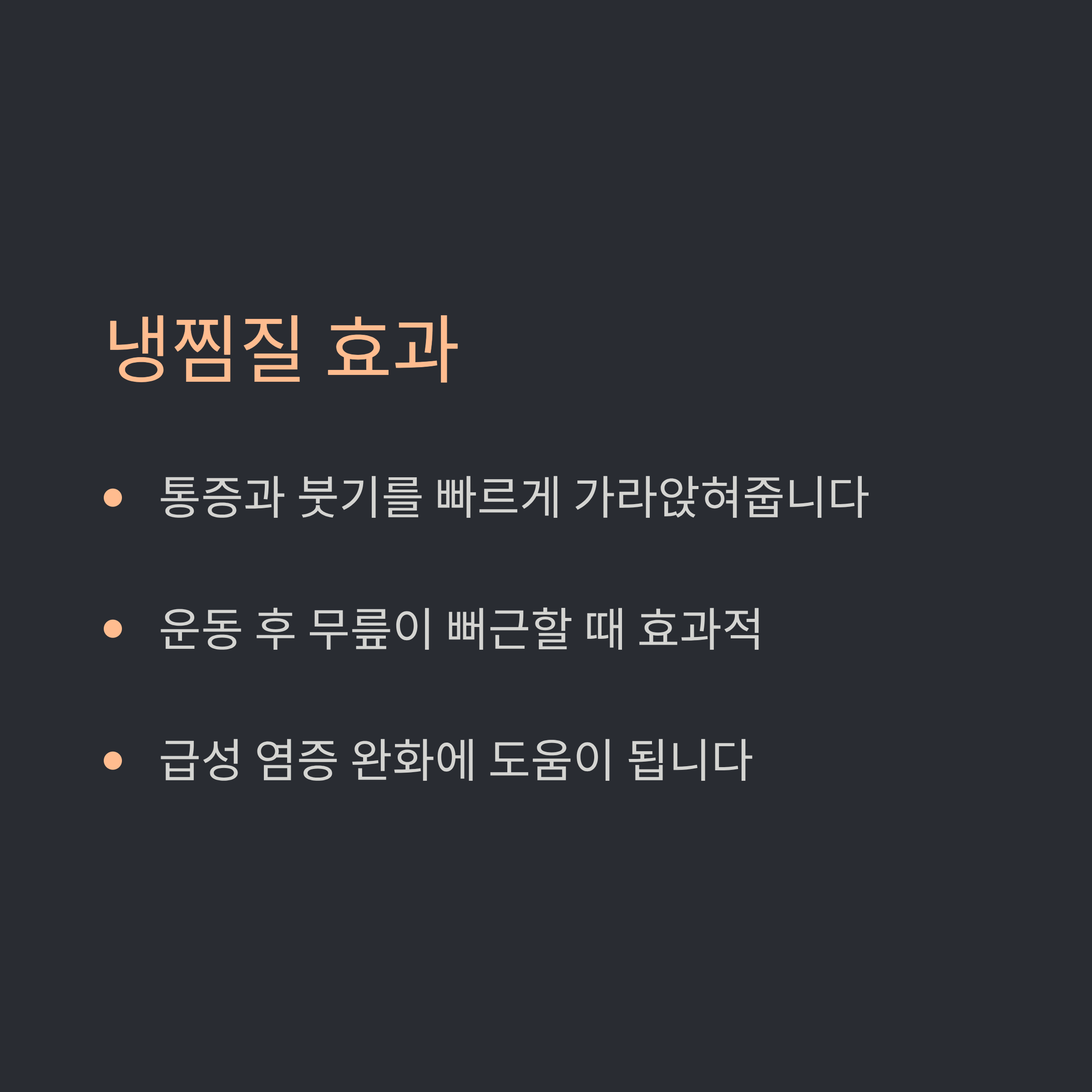 - Tip! 냉찜질은 통증과 붓기를 가라앉히는 데 탁월해요. 운동 후에 무릎이 좀 뻐근하거나, 무리해서 아플 때 바로 해주면 굿!