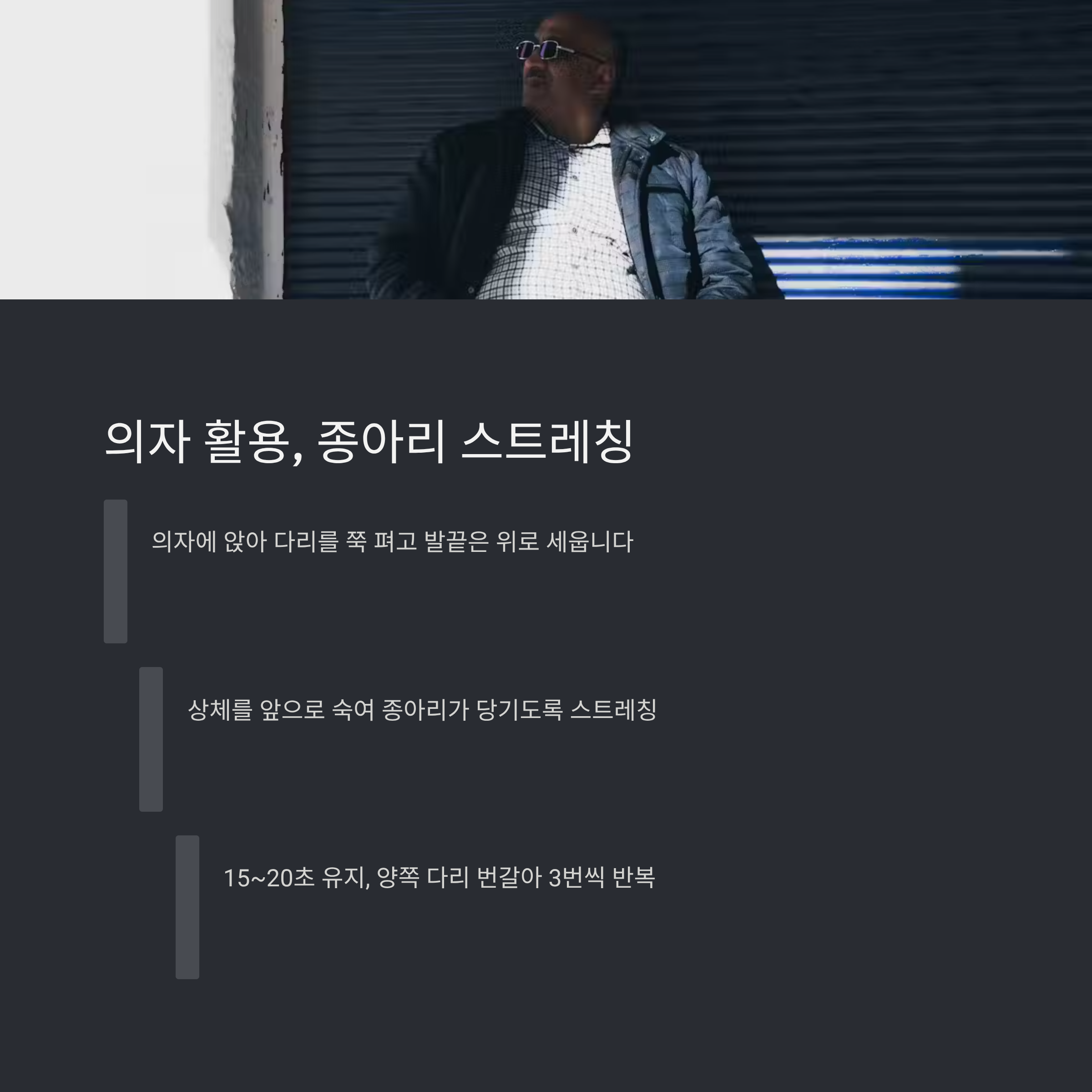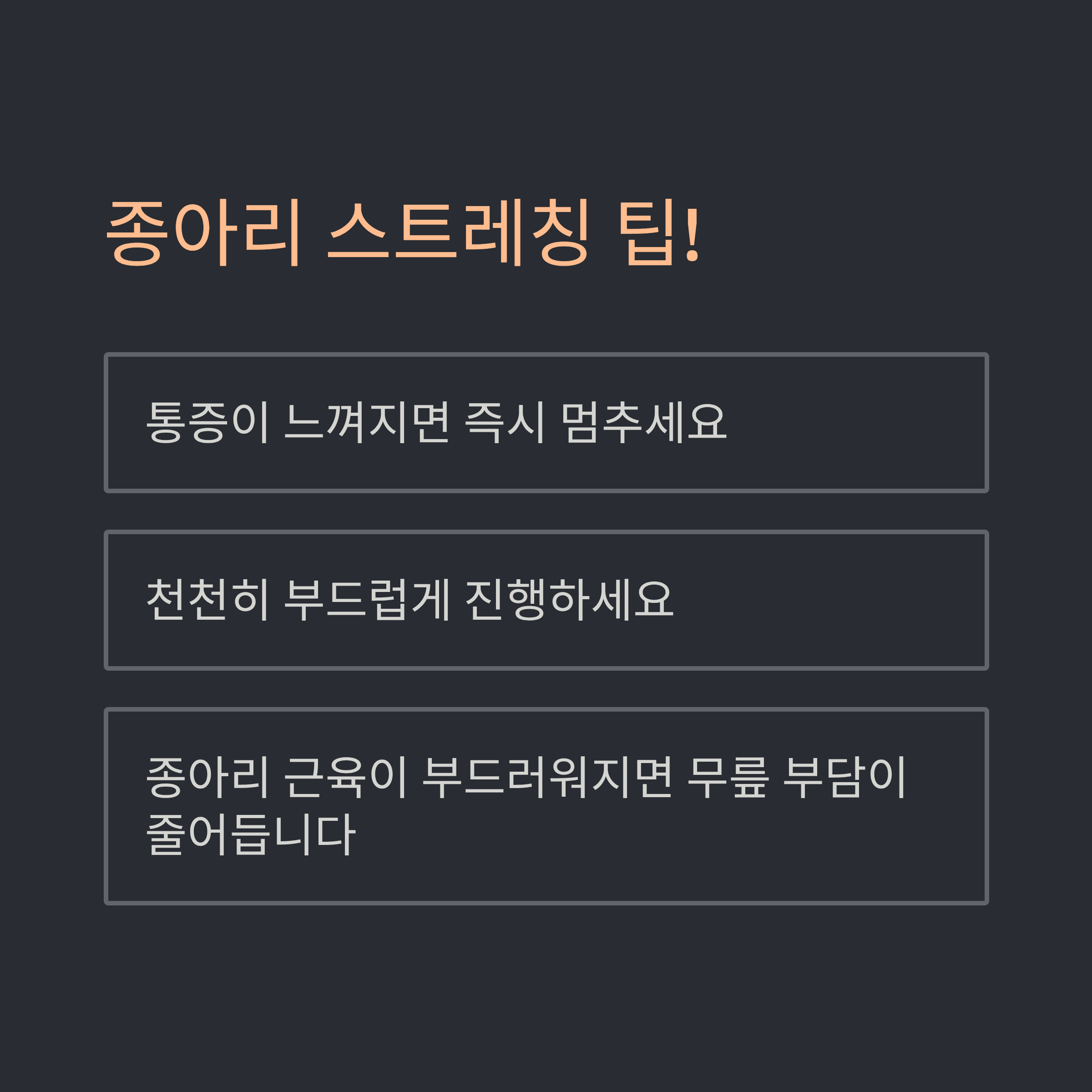 - Tip! 무릎이 아프지 않은 선에서 천천히 진행하고, 통증이 느껴지면 바로 멈춰주세요. 종아리 근육이 부드러워지면 무릎 부담이 훨씬 줄어든답니다!