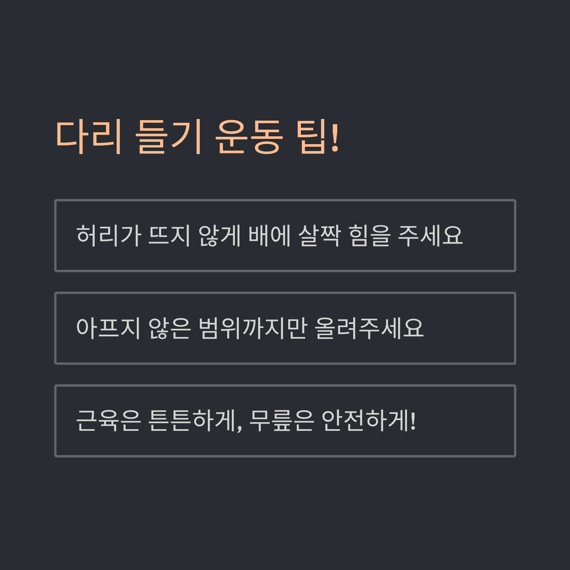- Tip! 허리가 뜨지 않게 배에 살짝 힘을 주고, 아프지 않은 범위까지만 올려주세요. 근육은 튼튼하게, 무릎은 안전하게!