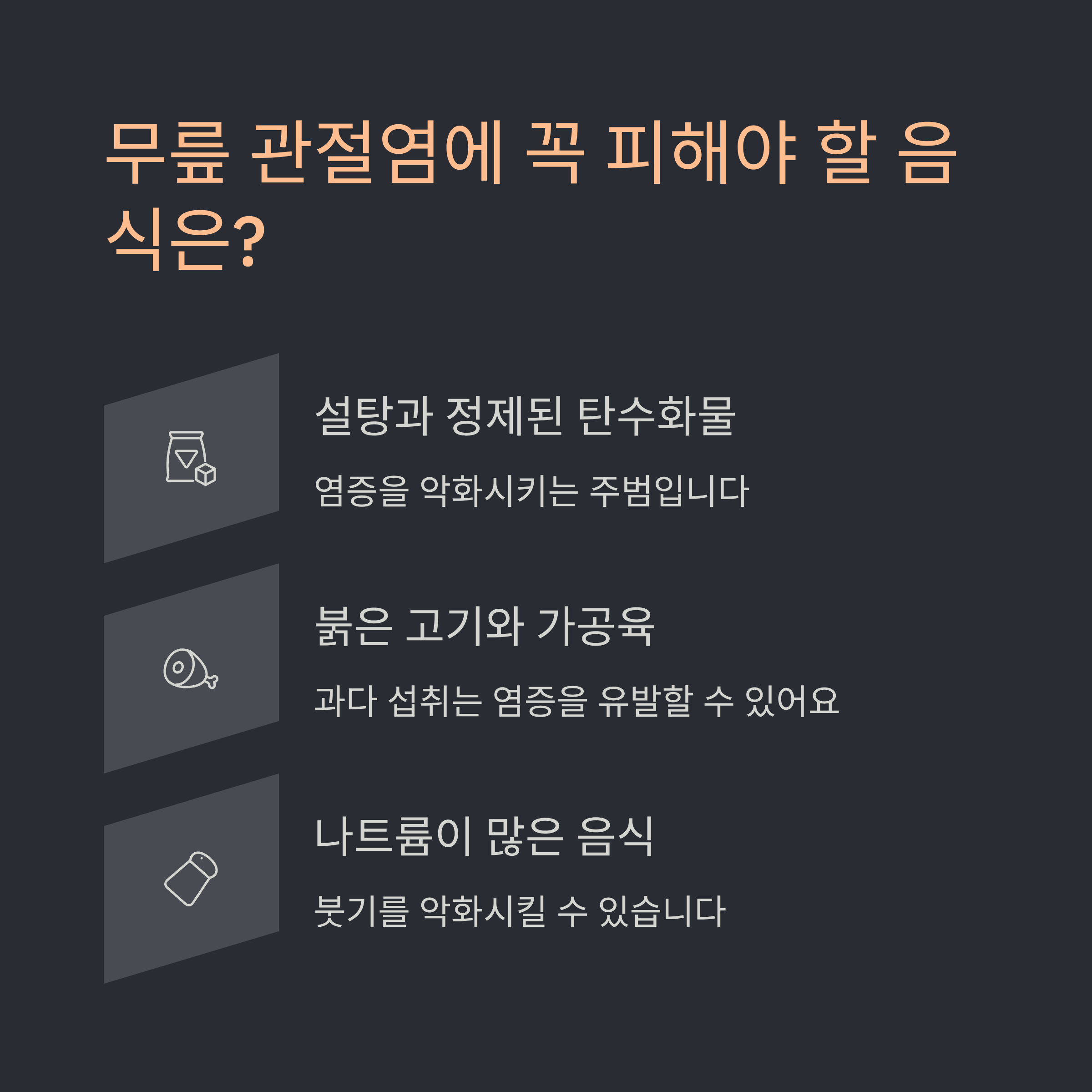 - 강황의 커큐민 성분, 브로콜리의 설포라판 성분 등은 강력한 항염 효과를 가지고 있어 관절 건강에 아주 유익해요. 평소 식단에 카레나 브로콜리 같은 채소를 자주 넣어 드시는 습관을 들이는 것이 좋습니다.