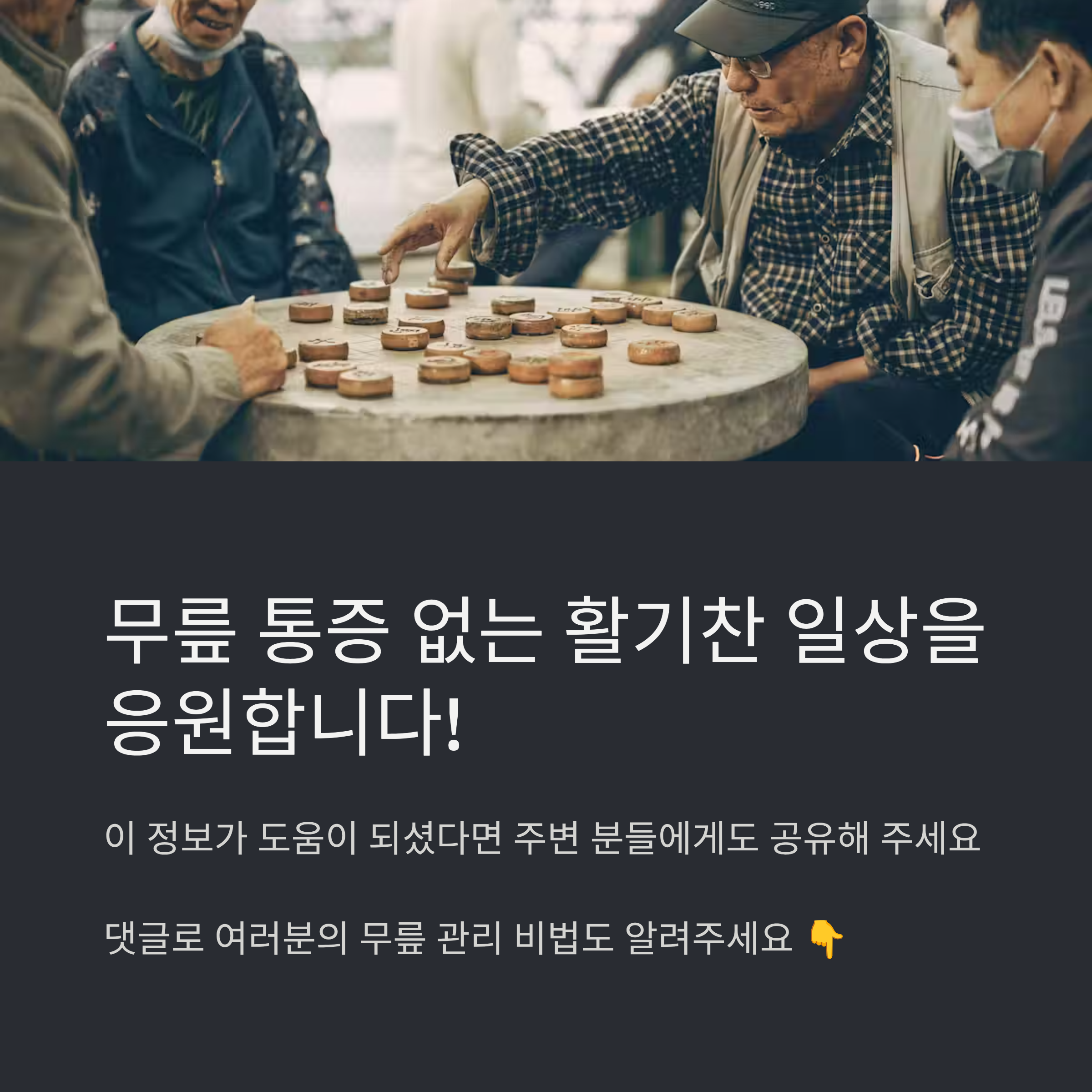 이 글이 여러분의 무릎 통증 없는 편안한 일상에 작은 빛이 되기를 바랍니다. 궁금한 점이 있다면 언제든지 댓글 남겨주세요!