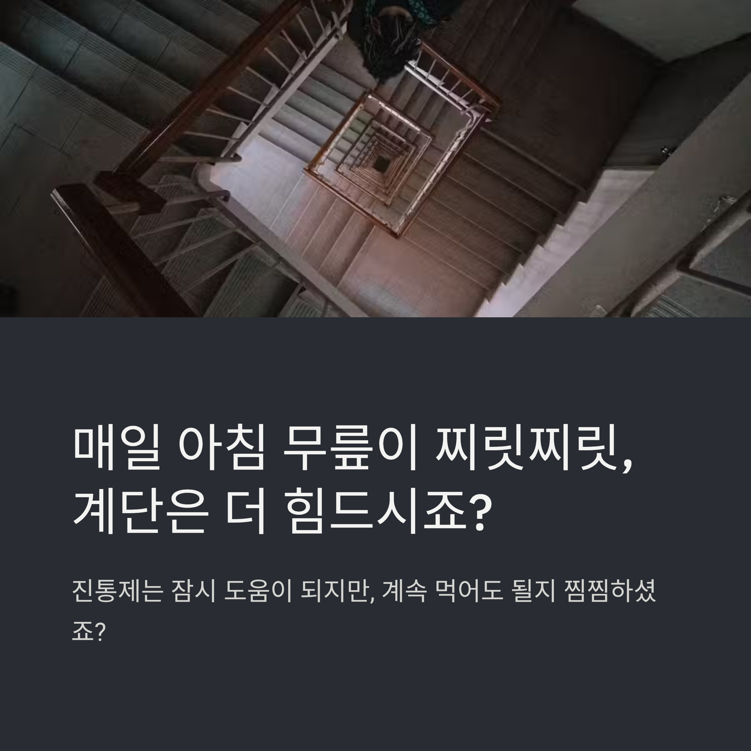 혹시 아침에 눈 뜨면 찌릿찌릿, 계단 오르내릴 때마다 삐걱거리는 무릎 때문에 고생하고 계신가요? 매일 먹는 진통제는 잠시 통증을 잊게 해주지만, 왠지 모르게 찜찜하고, 이대로 계속 먹어도 괜찮을까 걱정되시죠? ㅠㅠ