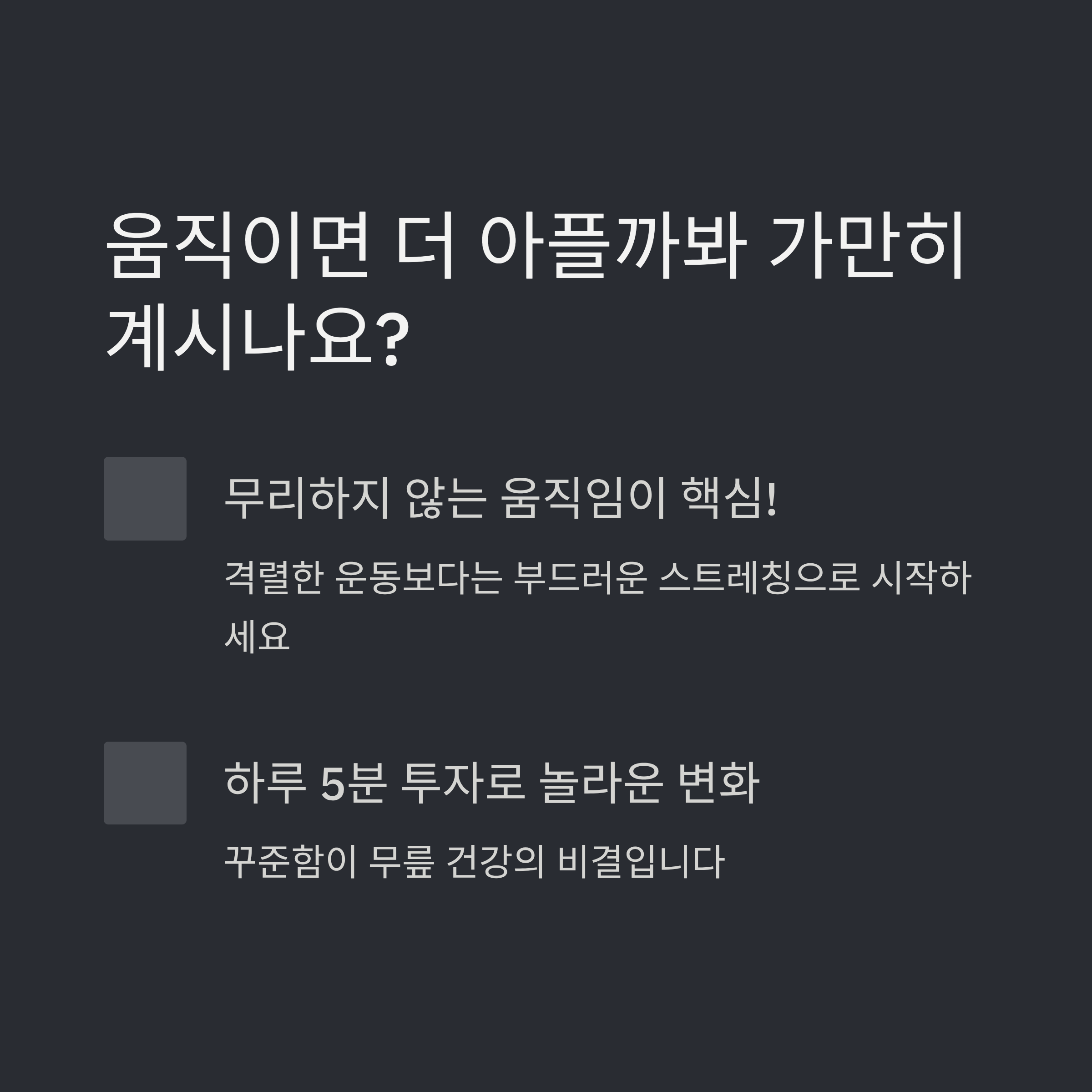 무릎 관절염 때문에 '움직이면 더 아플까 봐' 가만히 계시는 분들 많으시죠? 하지만! 오히려 꾸준한 움직임이 무릎 건강에는 보약이 된답니다! 단, 여기서 중요한 건 '무리하지 않는 움직임'이에요. 격렬한 운동 말고, 하루 단 5분만 투자해도 놀라운 효과를 볼 수 있는 스트레칭 2가지를 알려드릴게요.