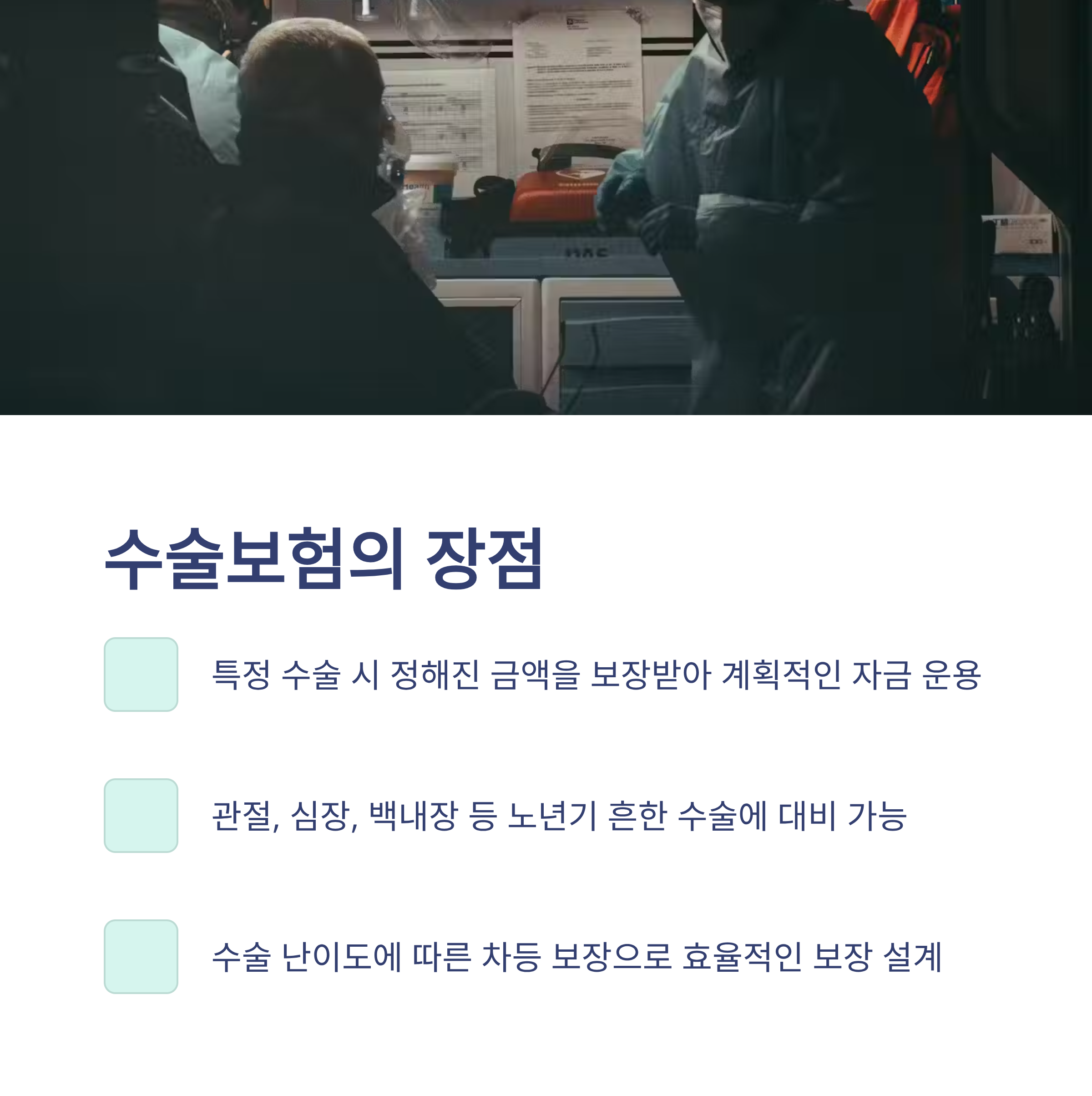 - 수술보험: 특정 질환 수술 시 고정 금액을 보장받습니다.
