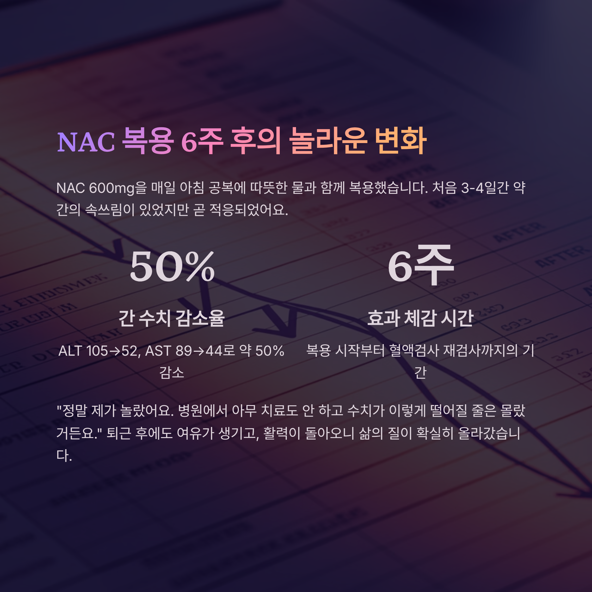 NAC, 정확히는 N-아세틸시스테인. 요즘 간 건강 관리에 좋다고 해서 많이들 찾는데요. 검색해보면 “간 수치 떨어졌다”, “피로가 줄었다”는 후기는 넘쳐나는데, 정작 진짜 복용 후 변화가 어땠는지 궁금하지 않으셨나요? 저도 ALT 수치가 비정상적으로 올라가면서 병원에서 권유받은 것도 아니고, 제 의지로 NAC를 알아보고 먹기 시작했습니다. 이 글에서는 직접 복용한 생생한 변화, 진짜 도움이 된 팁, 그리고 의외의 부작용까지 모두 솔직하게 공개합니다.