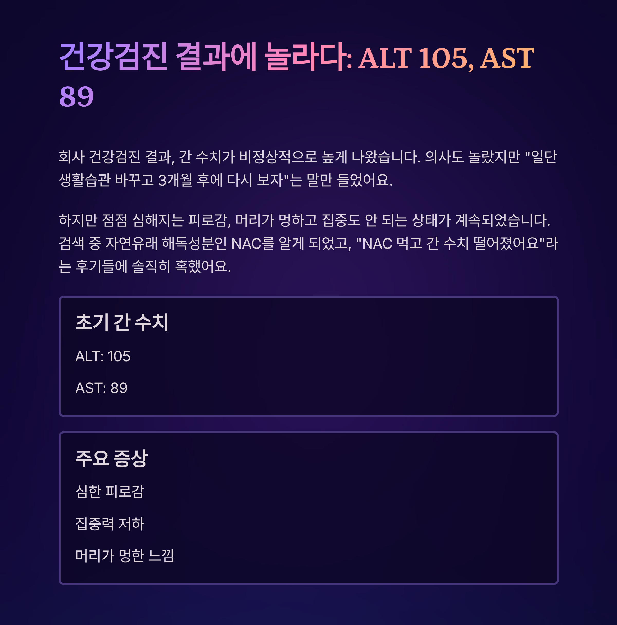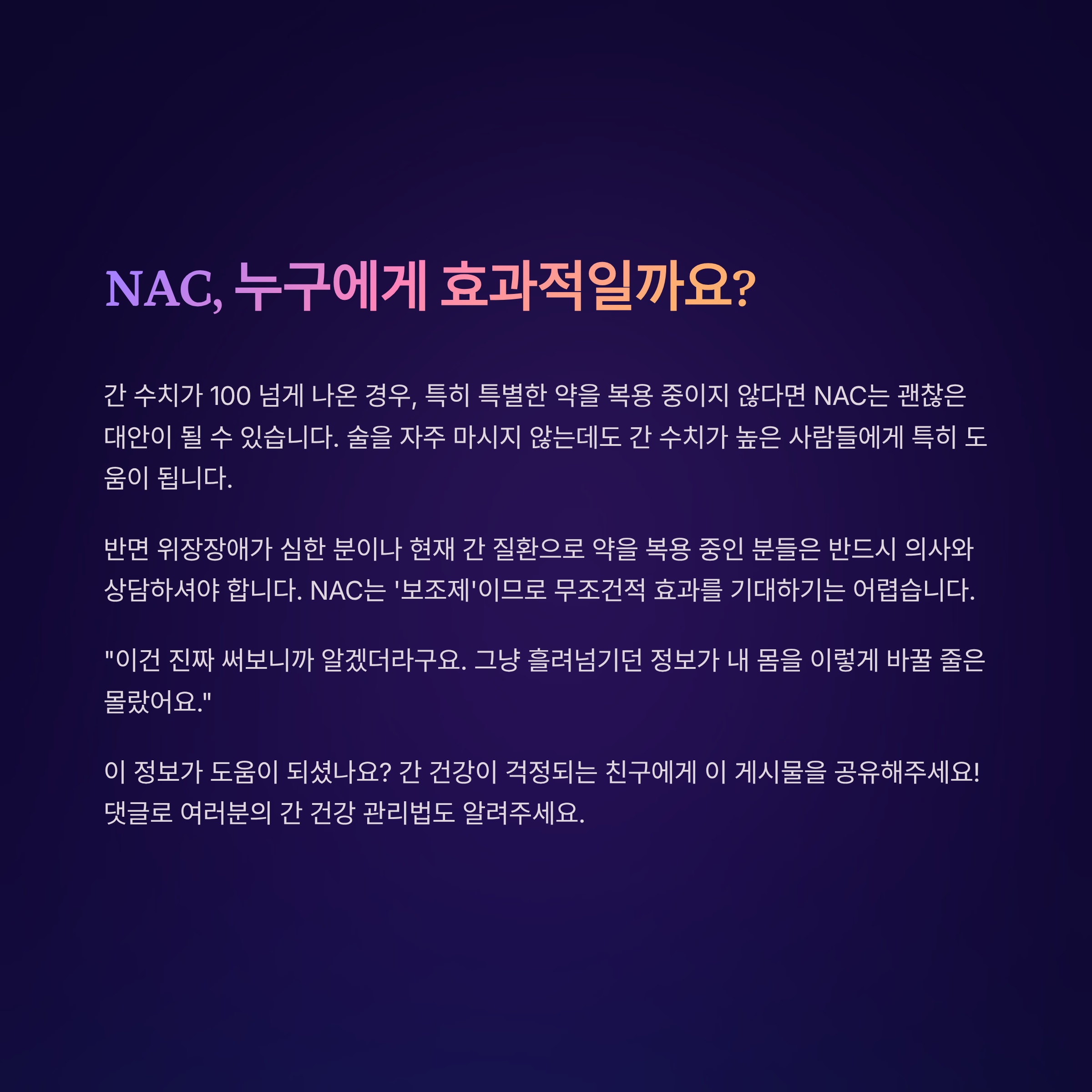 저처럼 간 수치가 100 넘게 나온 경우, 특히 특별한 약을 복용 중이지 않다면 NAC는 꽤 괜찮은 대안이에요. 특히 술을 자주 마시지 않는데도 간 수치가 높은 사람들에게는 NAC가 도움이 되는 경우가 많더라고요.