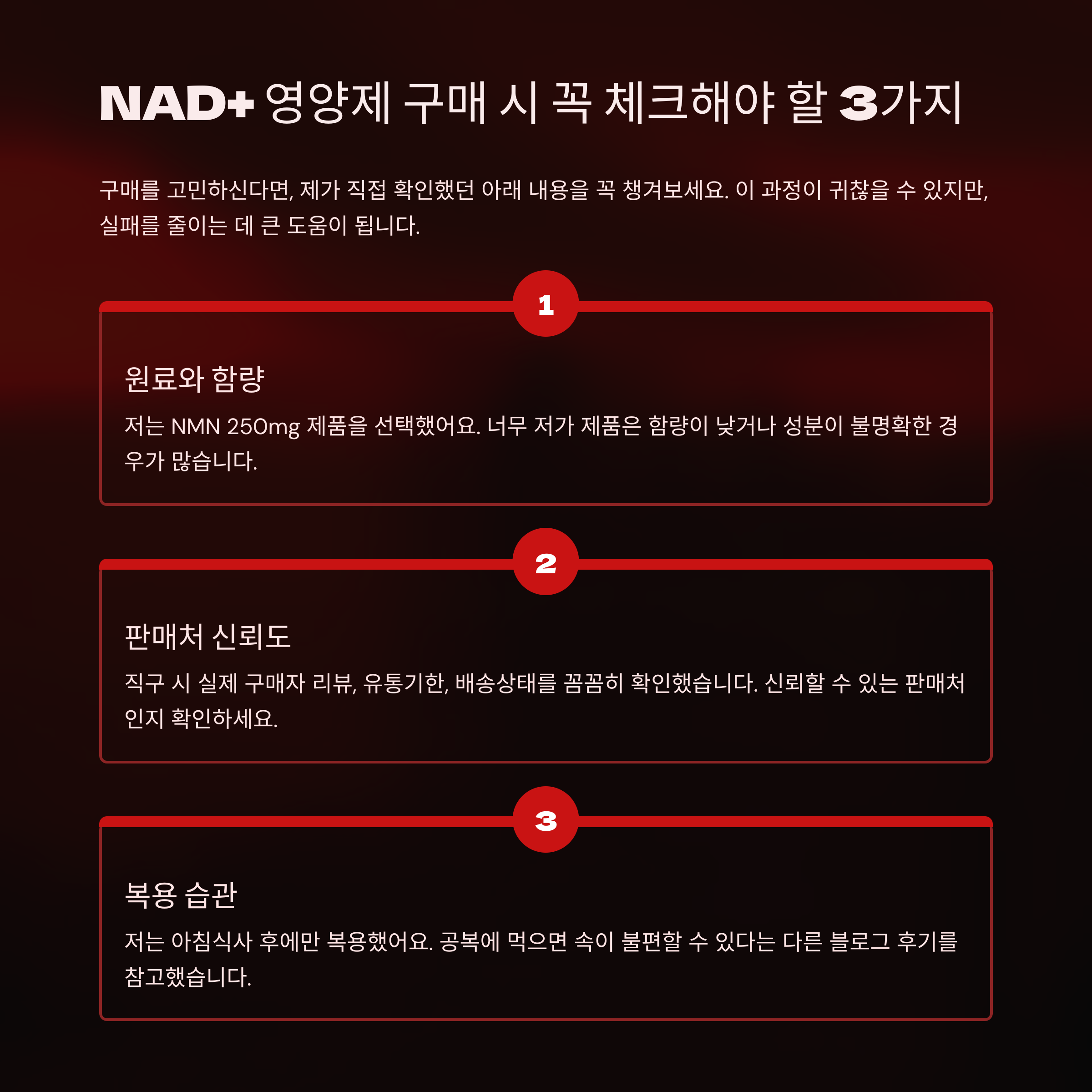 지금 이 글을 보고 계신 분이라면, NAD+ 영양제는 분명 매력적인 선택지입니다. 하지만 효과는 개인차가 크고, 단기간에 기적이 일어나는 건 아니었어요.