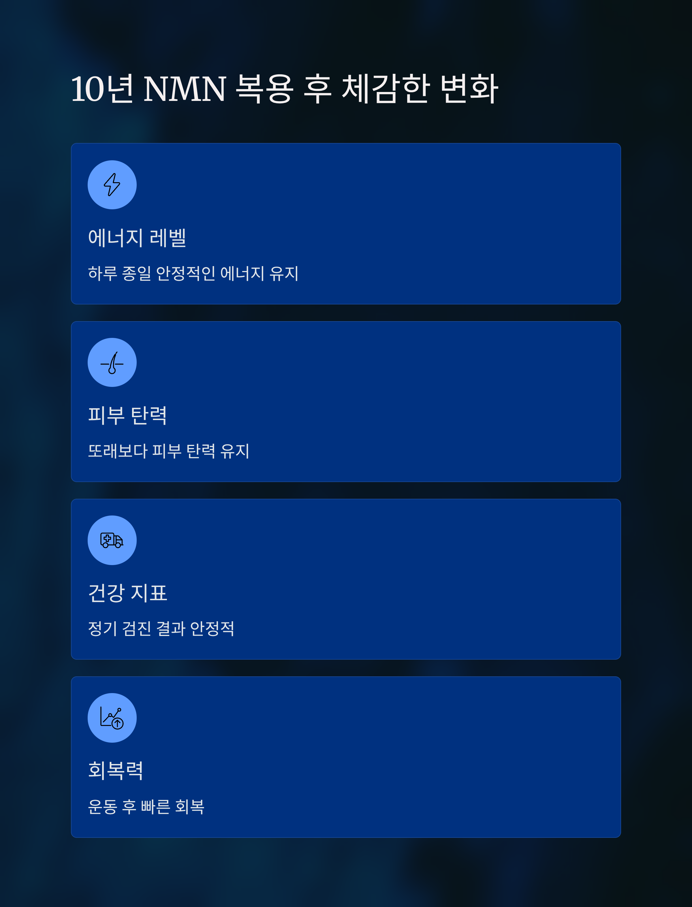 솔직히 처음에는 의심이 많았습니다. “정말 효과가 있을까?” 하는 생각이 컸죠. 하지만 꾸준히 복용하면서 제 생활 루틴에도 변화가 생겼습니다. 일찍 자고 일찍 일어나며, 운동과 함께 효모 NMN을 꾸준히 섭취하는 방식으로 10년 가까이 실천해 왔습니다. 가장 크게 느낀 건 피로 회복 속도였습니다. 예전 같으면 밤늦게까지 일하면 다음 날 무척 힘들었는데, 지금은 회복력이 훨씬 빨라졌습니다. 이건 진짜 경험해 보지 않으면 알 수 없는 차이더라구요.