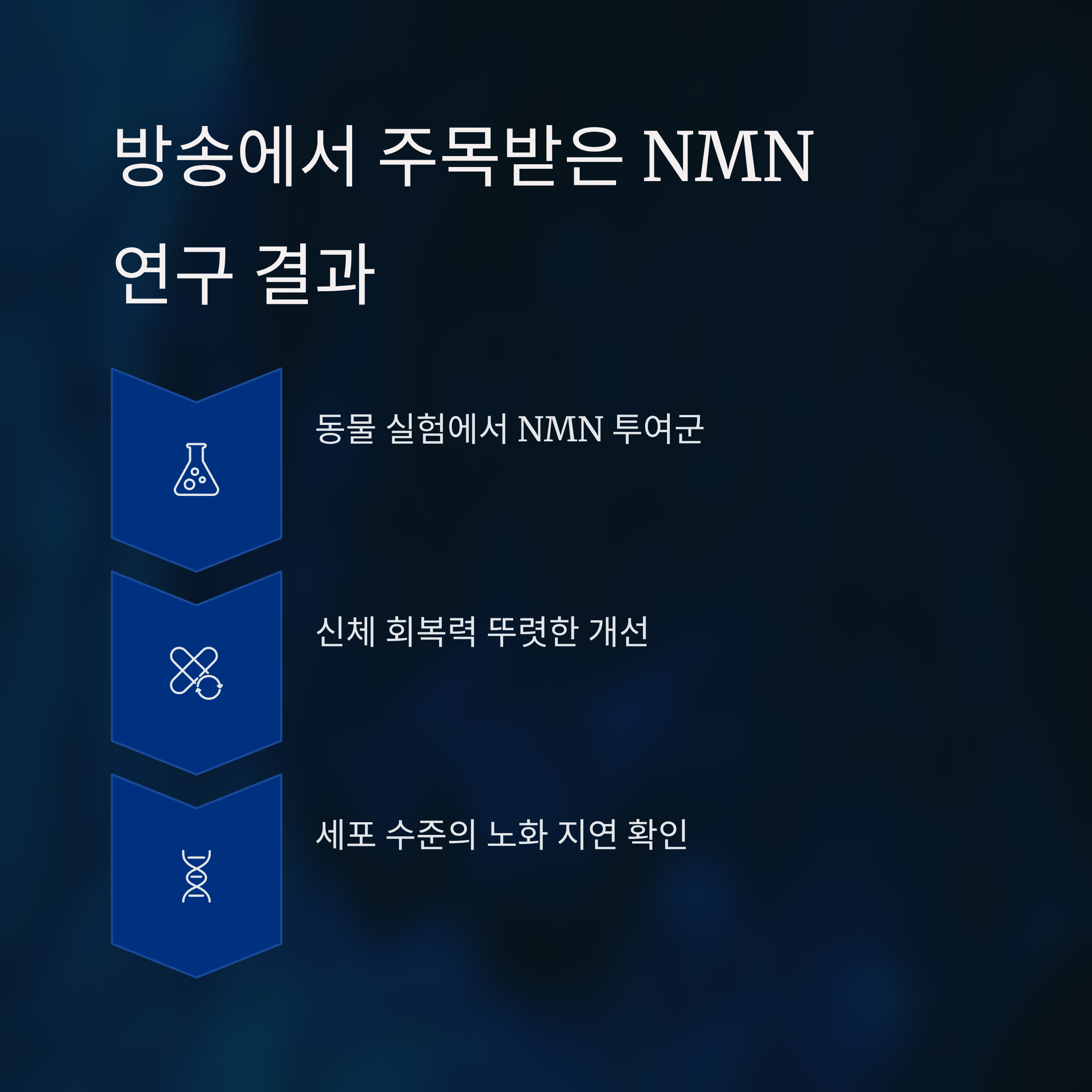 NMN이 일반 대중에게 알려진 계기 중 하나는 바로 건강 관련 방송이었습니다. TVN ‘너의 몸소리가 들려’에서도 NMN의 연구가 소개되었는데, 당시 저도 방송을 보며 메모해 뒀습니다. 방송에서는 동물 대상 실험에서 NMN 투여군의 신체 회복력이 뚜렷하게 달라졌다는 부분이 인상적이었는데요, 그 이후 저 역시 관심을 갖고 꾸준히 자료를 찾아봤습니다.