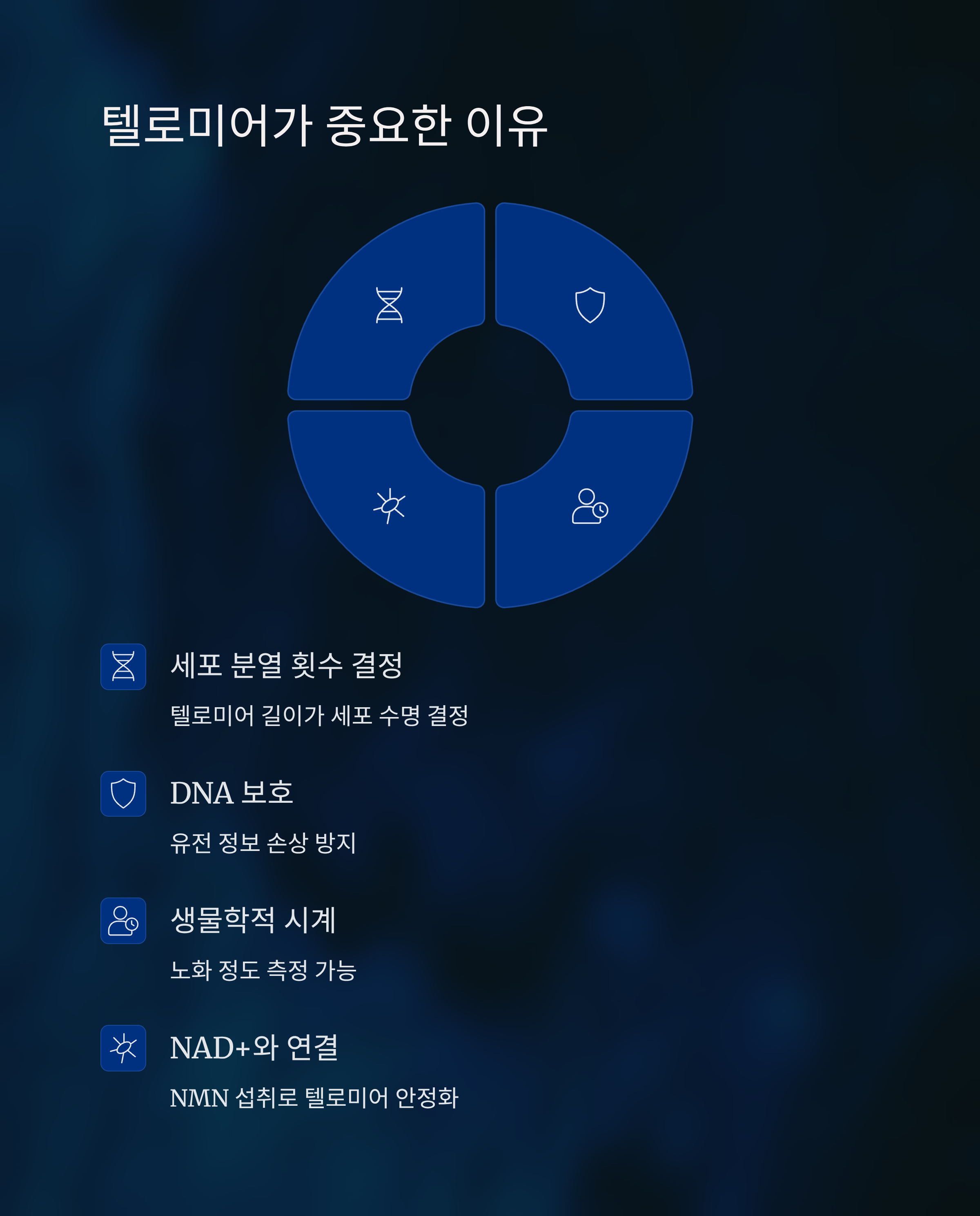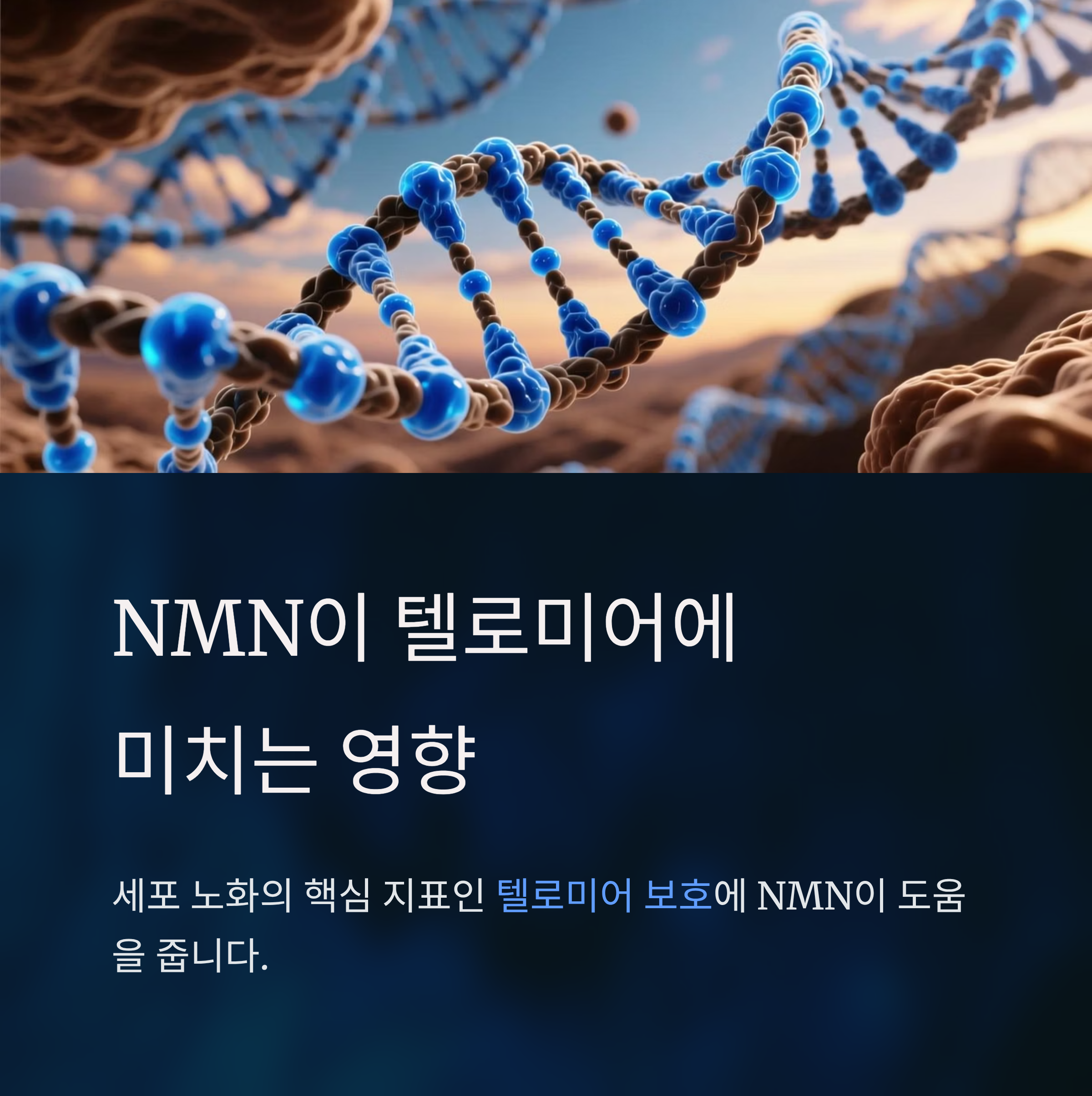 노화를 늦추는 핵심 중 하나는 세포의 텔로미어를 보호하는 것입니다. 텔로미어는 세포가 분열할 때마다 짧아지는데, NMN이 NAD+ 수치를 올려 세포 회복을 돕는 과정에서 텔로미어 안정성에도 긍정적인 영향을 준다고 알려져 있습니다. 저는 실제로 꾸준히 복용하면서 피부와 체력 변화가 체감되었고, 검진 결과에서도 이전보다 건강 지표가 안정적이었습니다. 물론 단순히 보충제만으로 되는 게 아니라, 생활 습관과 운동을 함께 병행해야 더 효과적이었습니다.