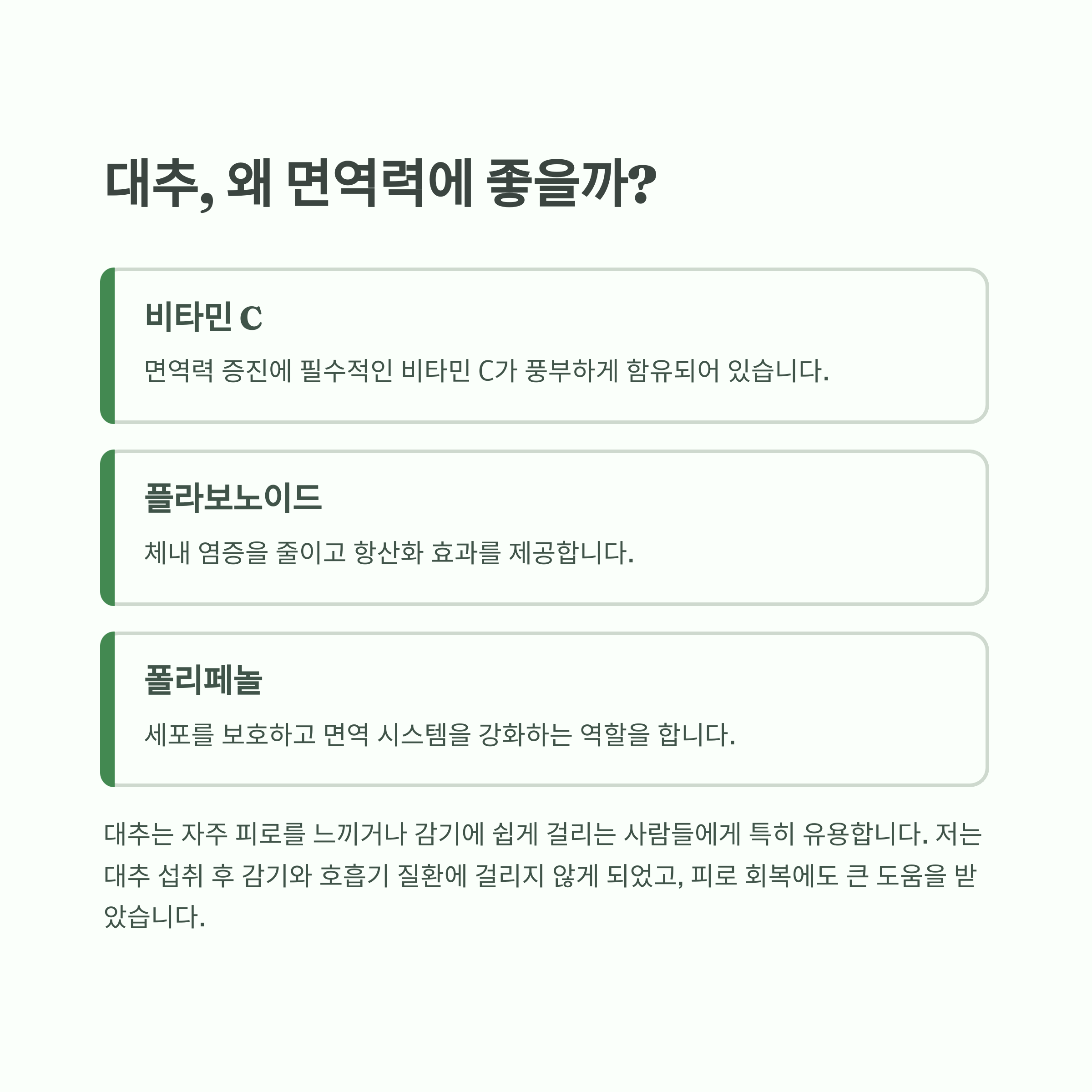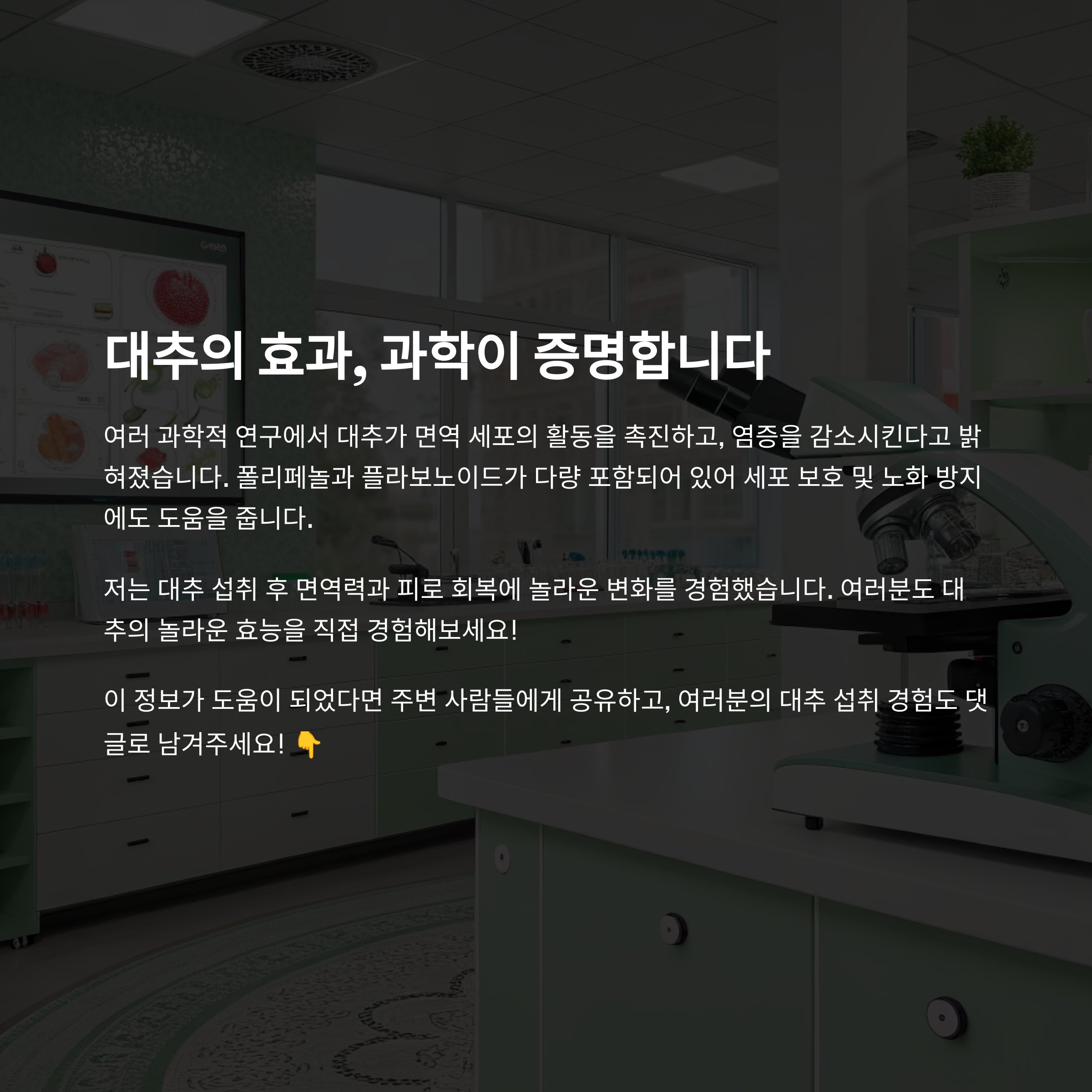저는 개인적으로 대추를 섭취한 후, 면역력과 피로 회복에 긍정적인 영향을 느꼈고, 그 변화를 과학적으로 뒷받침하는 연구 결과들도 신뢰할 수 있었습니다.